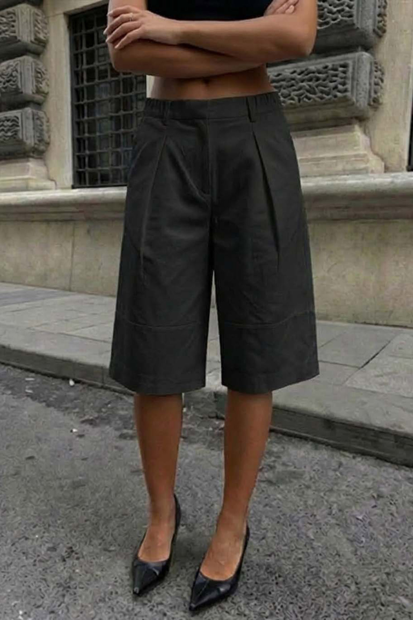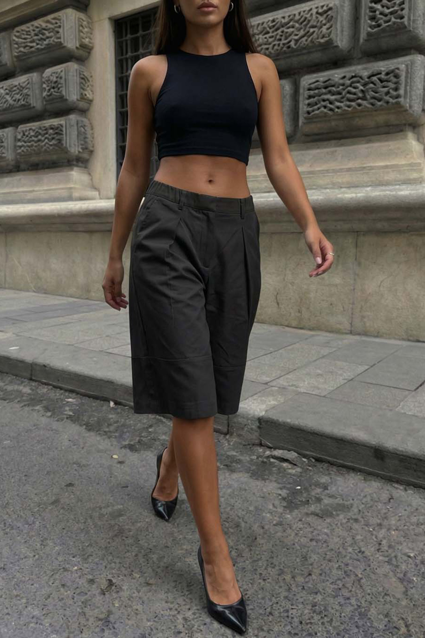 Υφασμάτινη βερμούδα αποτελεί την επιτομή του “office chic” στυλ σε μια πιο καλοκαιρινή εκδοχή. Η ψηλόμεση γραμμή της, σε συνδυασμό με τις κομψές πιέτες στο μπροστινό μέρος, χαρίζει μια δομημένη και σοφιστικέ όψη.