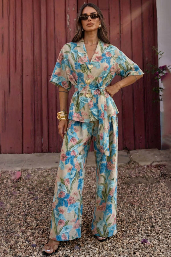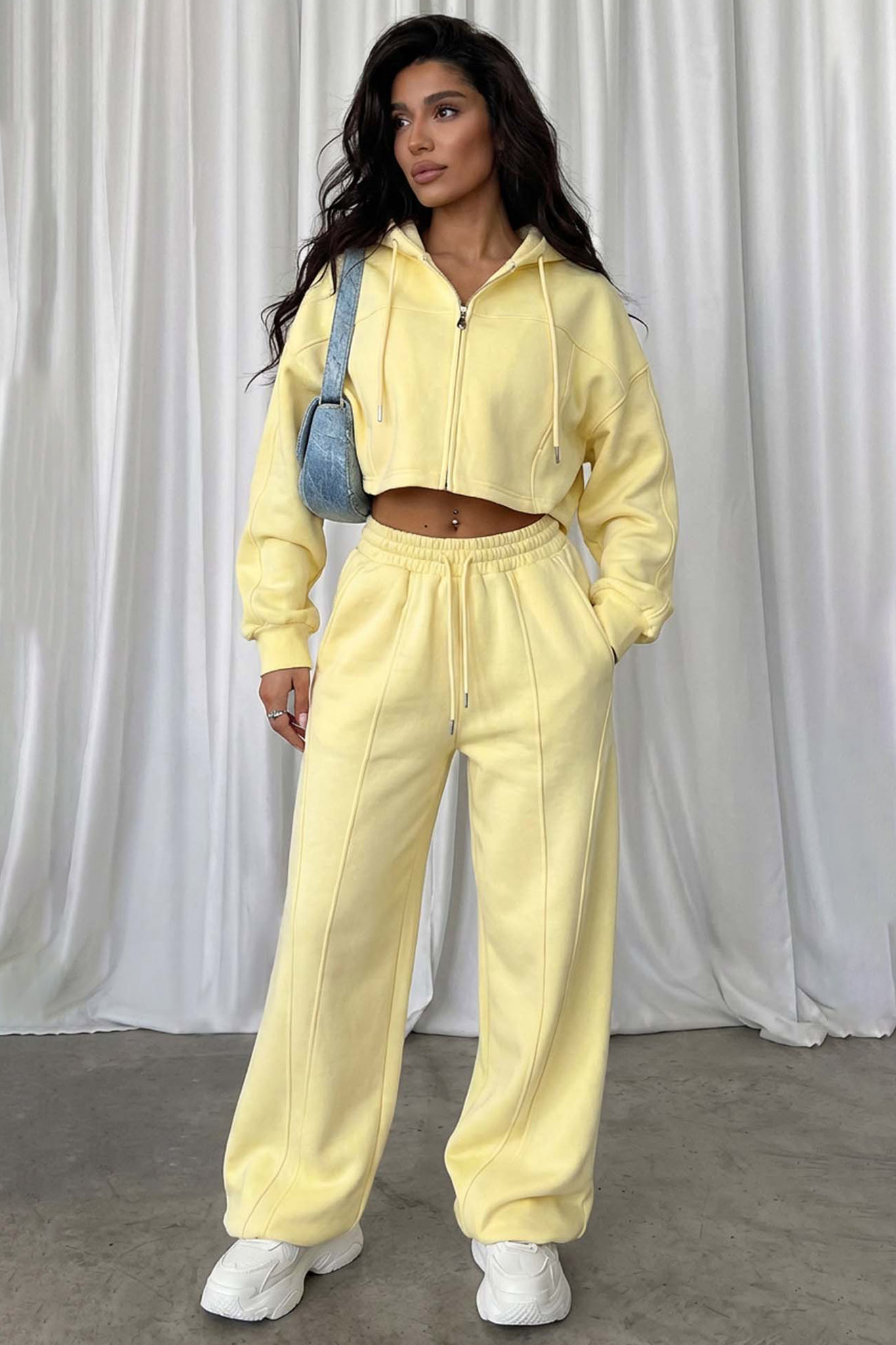Σετ φόρμας, η οποία συνδυάζει μια cropped ζακέτα με κουκούλα και φερμουάρ με ένα παντελόνι σε φαρδιά γραμμή. Η ζακέτα χαρακτηρίζεται από το λάστιχο στο τελείωμα που τονίζει τη μέση, ενώ το παντελόνι διαθέτει εμφανείς κάθετες ραφές που προσδίδουν στυλ και επιμηκύνουν τη σιλουέτα, καθώς και ελαστική μέση με κορδόνι για άψογη εφαρμογή.
