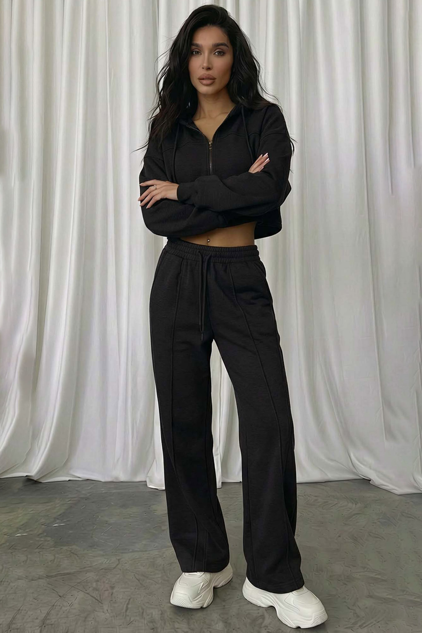 Σετ φόρμας, η οποία συνδυάζει μια cropped ζακέτα με κουκούλα και φερμουάρ με ένα παντελόνι σε φαρδιά γραμμή. Η ζακέτα χαρακτηρίζεται από το λάστιχο στο τελείωμα που τονίζει τη μέση, ενώ το παντελόνι διαθέτει εμφανείς κάθετες ραφές που προσδίδουν στυλ και επιμηκύνουν τη σιλουέτα, καθώς και ελαστική μέση με κορδόνι για άψογη εφαρμογή.