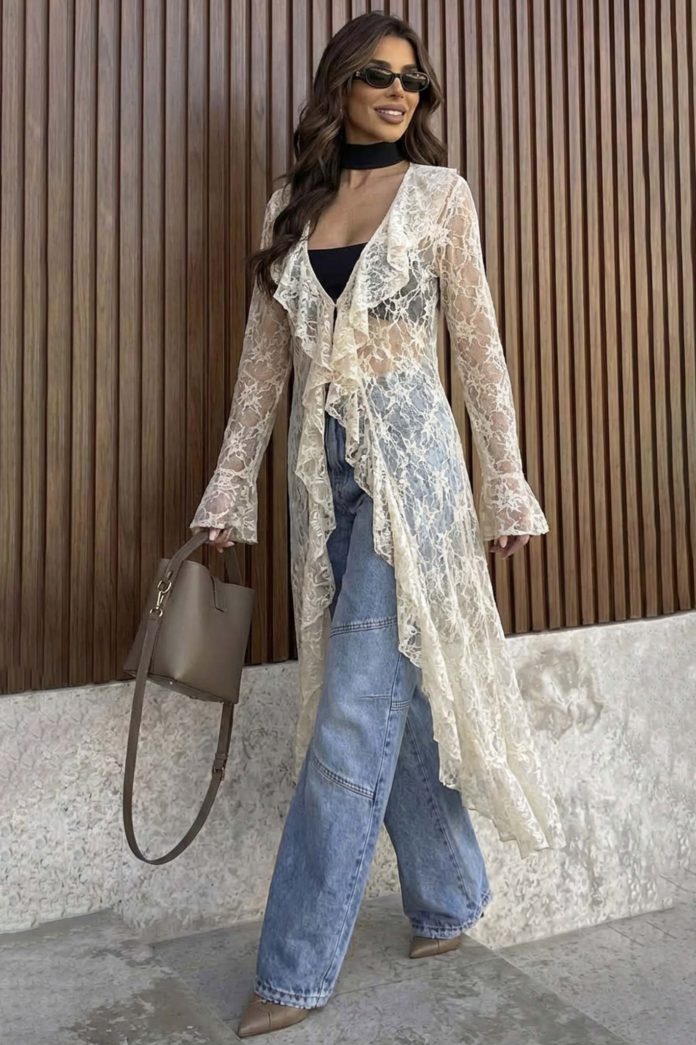 Δαντελένιο κιμονό το οποίο διαθέτει διάφανη δαντέλα με περίτεχνα μοτίβα και εντυπωσιακά βολάν κατά μήκος του ανοίγματος και στα μανίκια. Το μάξι μήκος του σε συνδυασμό με τα μανίκια-καμπάνα προσδίδει μια ρομαντική και μποέμ αισθητική, ενώ το δέσιμο στο στήθος επιτρέπει την προσαρμογή του στυλ ανάλογα με το σύνολο.