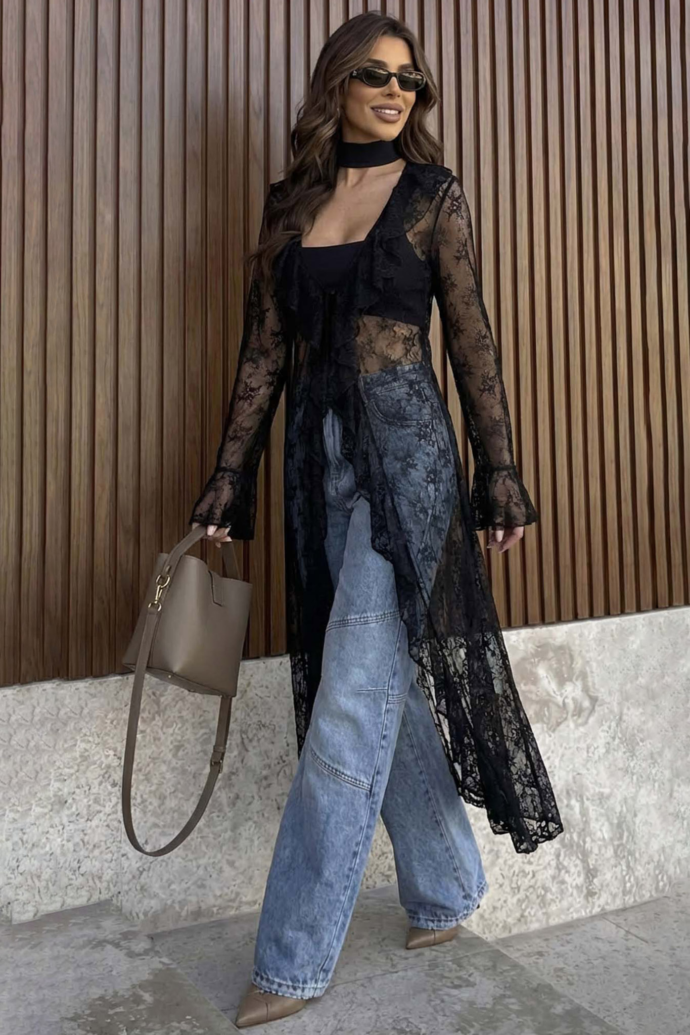 Eleganceδαντελένιο κιμονό με βολάν και μανίκια καμπάνα μαύρο