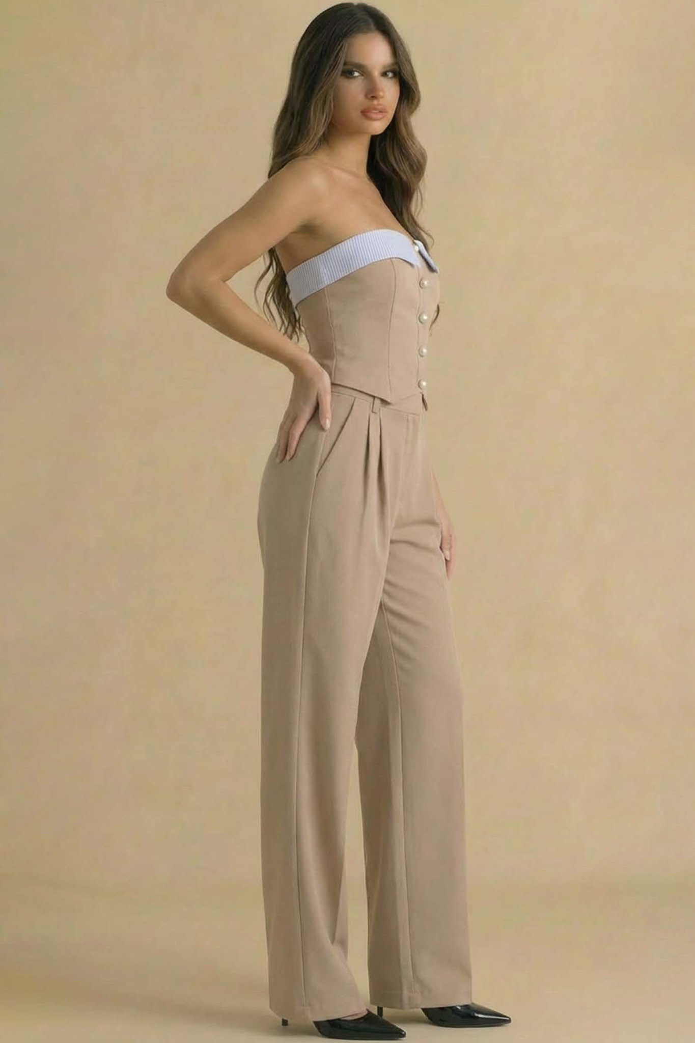Σετ με στράπλες μπούστο κορσέ με κουμπιά και γαλάζια λεπτομέρεια, σε συνδυασμό με φαρδύ παντελόνι με πιέτες.