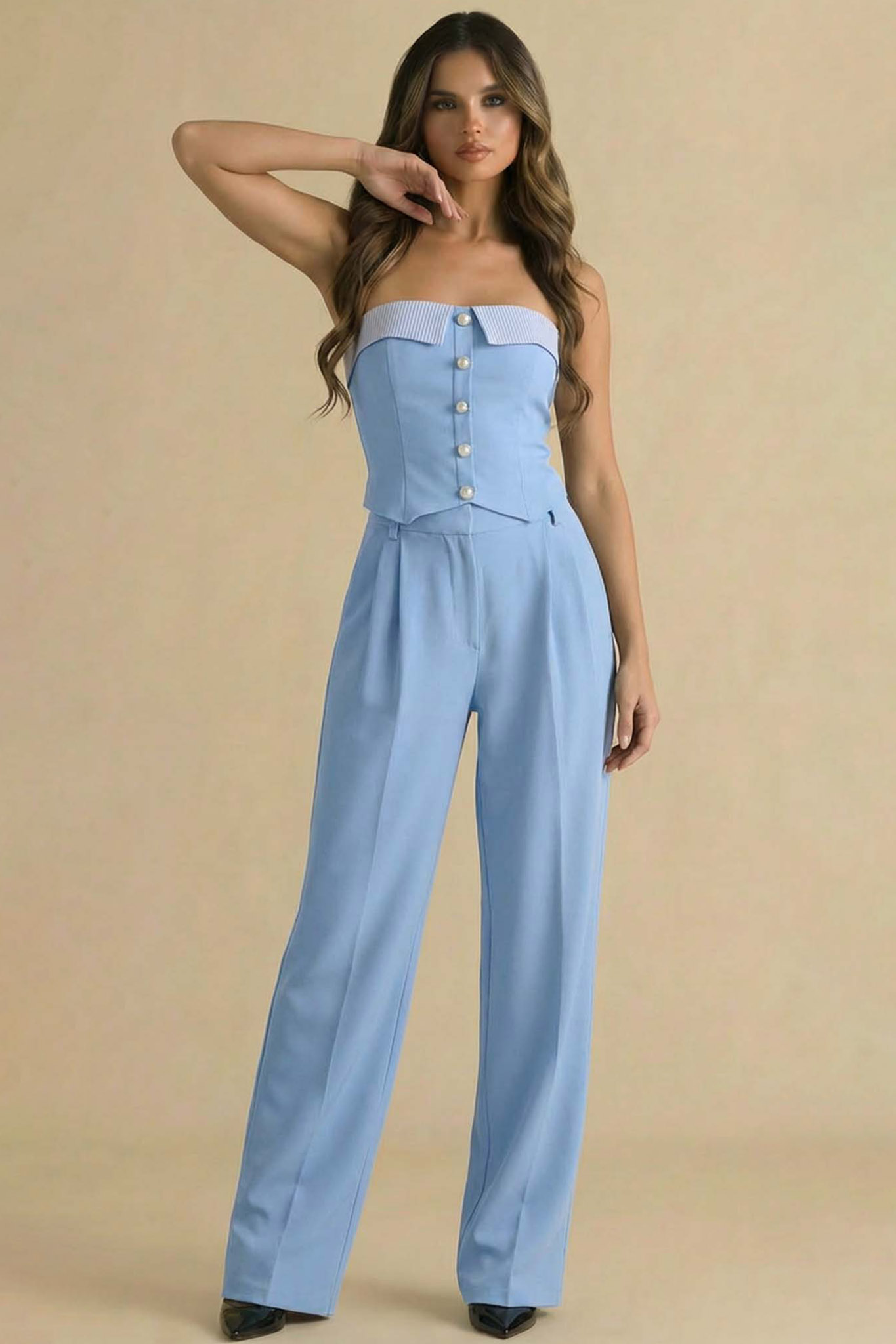 Σετ με στράπλες μπούστο κορσέ με κουμπιά και γαλάζια λεπτομέρεια, σε συνδυασμό με φαρδύ παντελόνι με πιέτες.