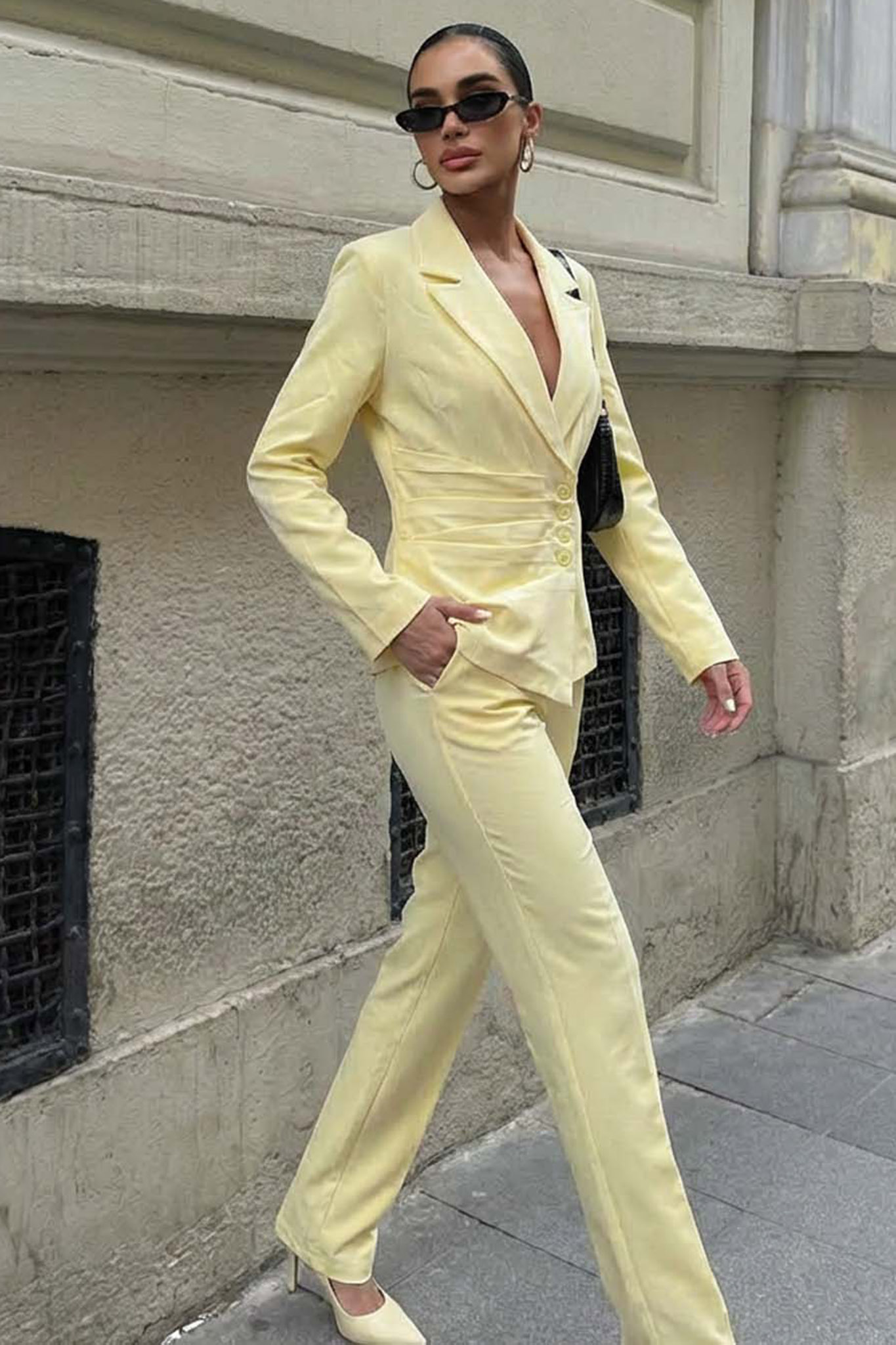 Σετ Κοστούμι Σακάκι με Σούρες & Παντελόνα. Διαθέτει μεσάτη εφαρμογή που κολακεύει τη μέση και ιδιαίτερες σούρες στο πλάι που δίνουν κίνηση και στυλ.
