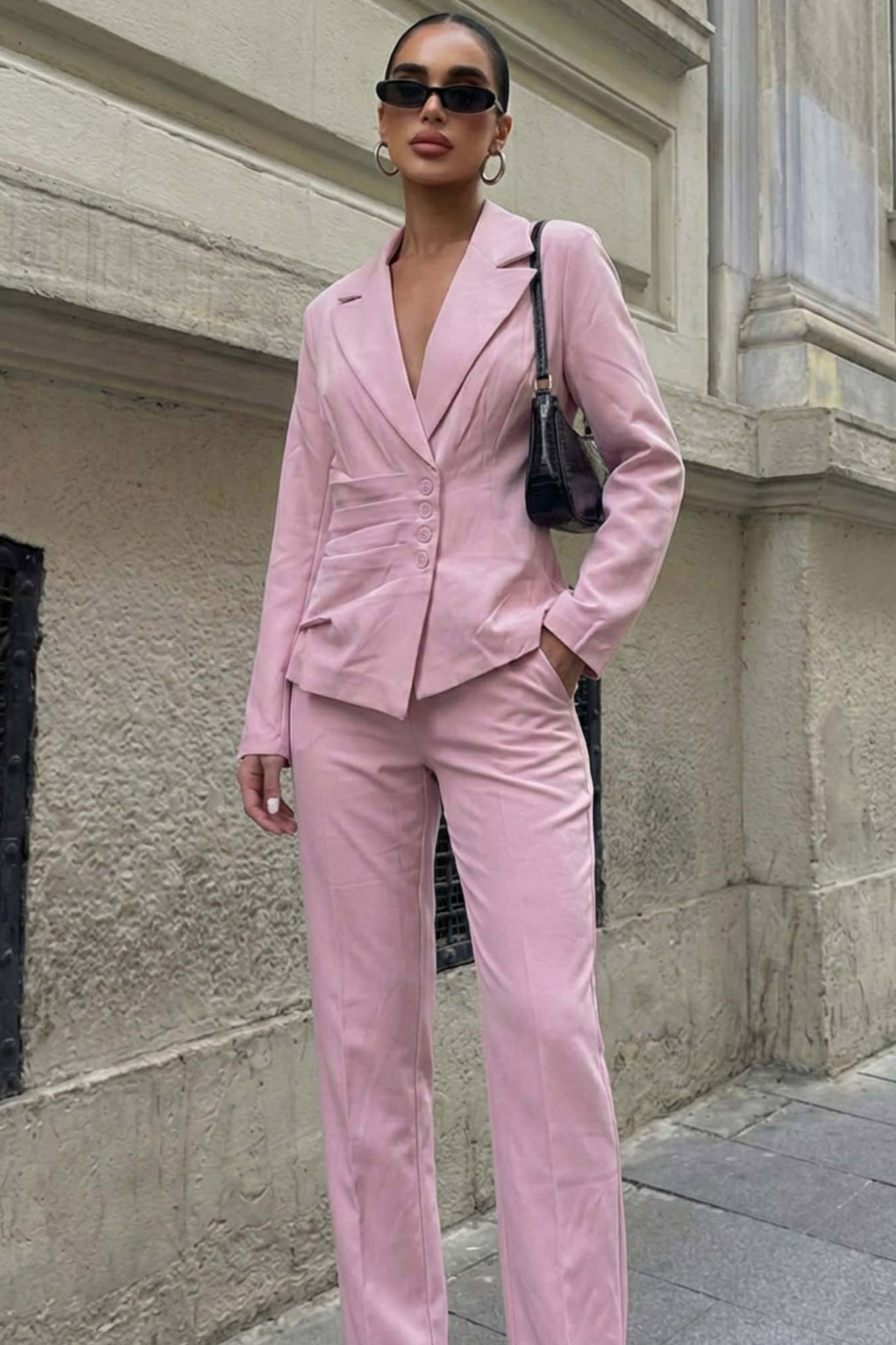 Σετ Κοστούμι Σακάκι με Σούρες & Παντελόνα. Διαθέτει μεσάτη εφαρμογή που κολακεύει τη μέση και ιδιαίτερες σούρες στο πλάι που δίνουν κίνηση και στυλ.