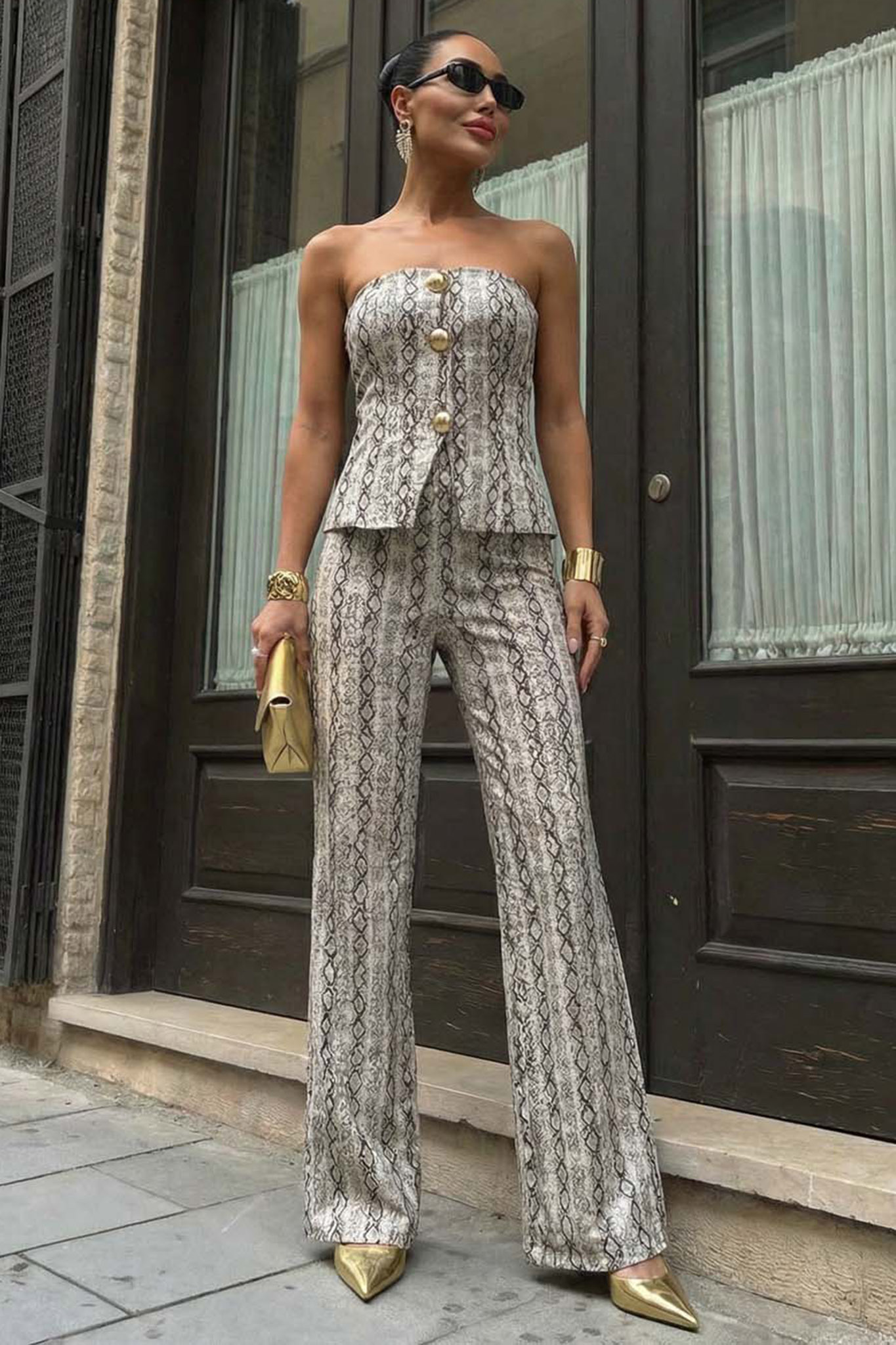 Elvinaσετ τοπ παντελόνι εμπριμέ μπεζ