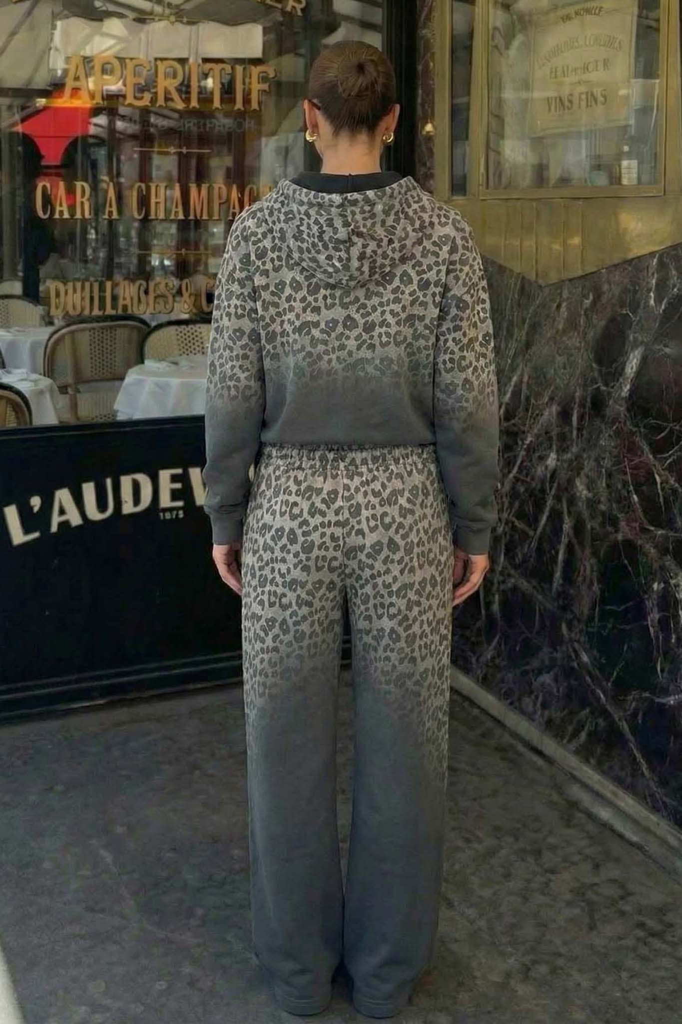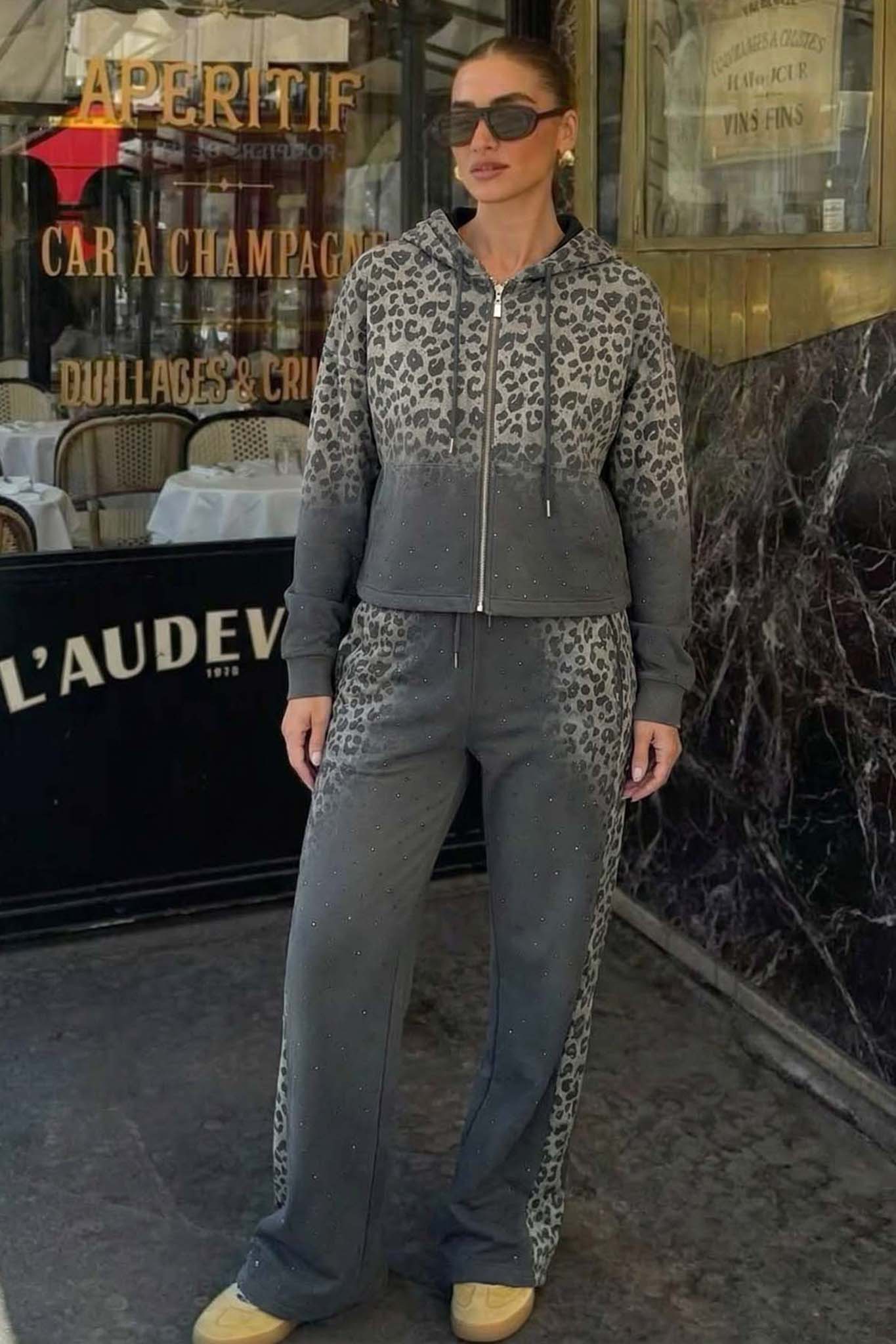 ’νετο και στιλάτο σετ φόρμας σε γκρι απόχρωση με εντυπωσιακό animal print σχέδιο τύπου λεοπάρ στο πάνω και κάτω μέρος. Το σετ περιλαμβάνει ζακέτα με κουκούλα και φερμουάρ, καθώς και παντελόνι με λάστιχο στη μέση για τέλεια εφαρμογή και άνεση όλη μέρα. Ιδανικό για casual εμφανίσεις με μοντέρνα πινελιά, συνδυάζοντας άνεση και μόδα.