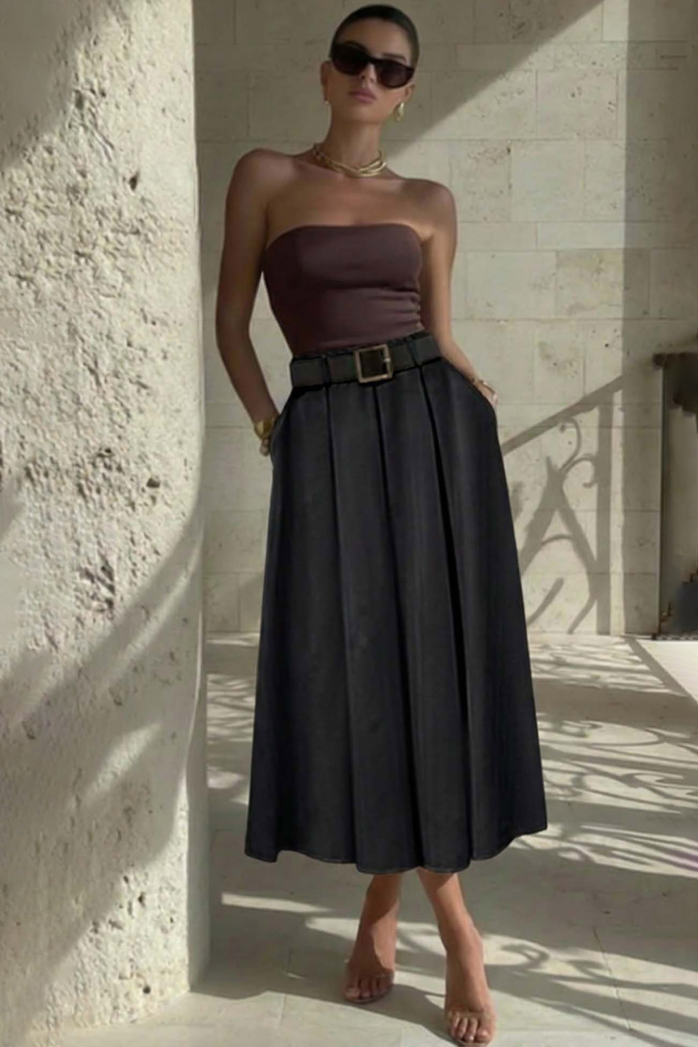 Αυτή η κομψή φούστα με πιέτες είναι το ιδανικό κομμάτι για να ανανεώσετε τη γκαρνταρόμπα σας. Σχεδιασμένη να προσφέρει άνεση και στυλ, είναι ευκολοφόρετη και ταιριάζει σε πολλές περιστάσεις