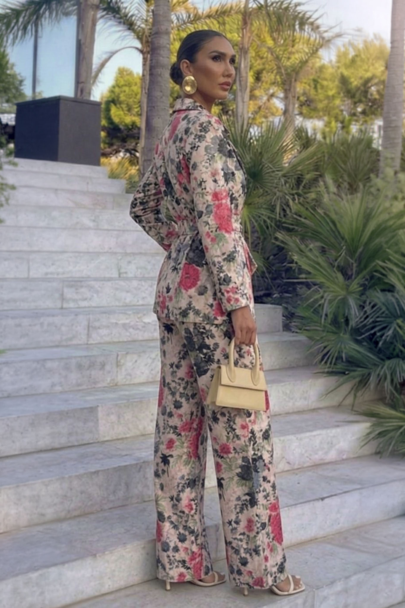 Σετ σακάκι με ζώνη & Wide-Leg παντελόνα. Ένα floral total look σετ που συνδυάζει την κλασική κομψότητα ενός κοστουμιού με τη ζωντάνια των ανοιξιάτικων χρωμάτων.