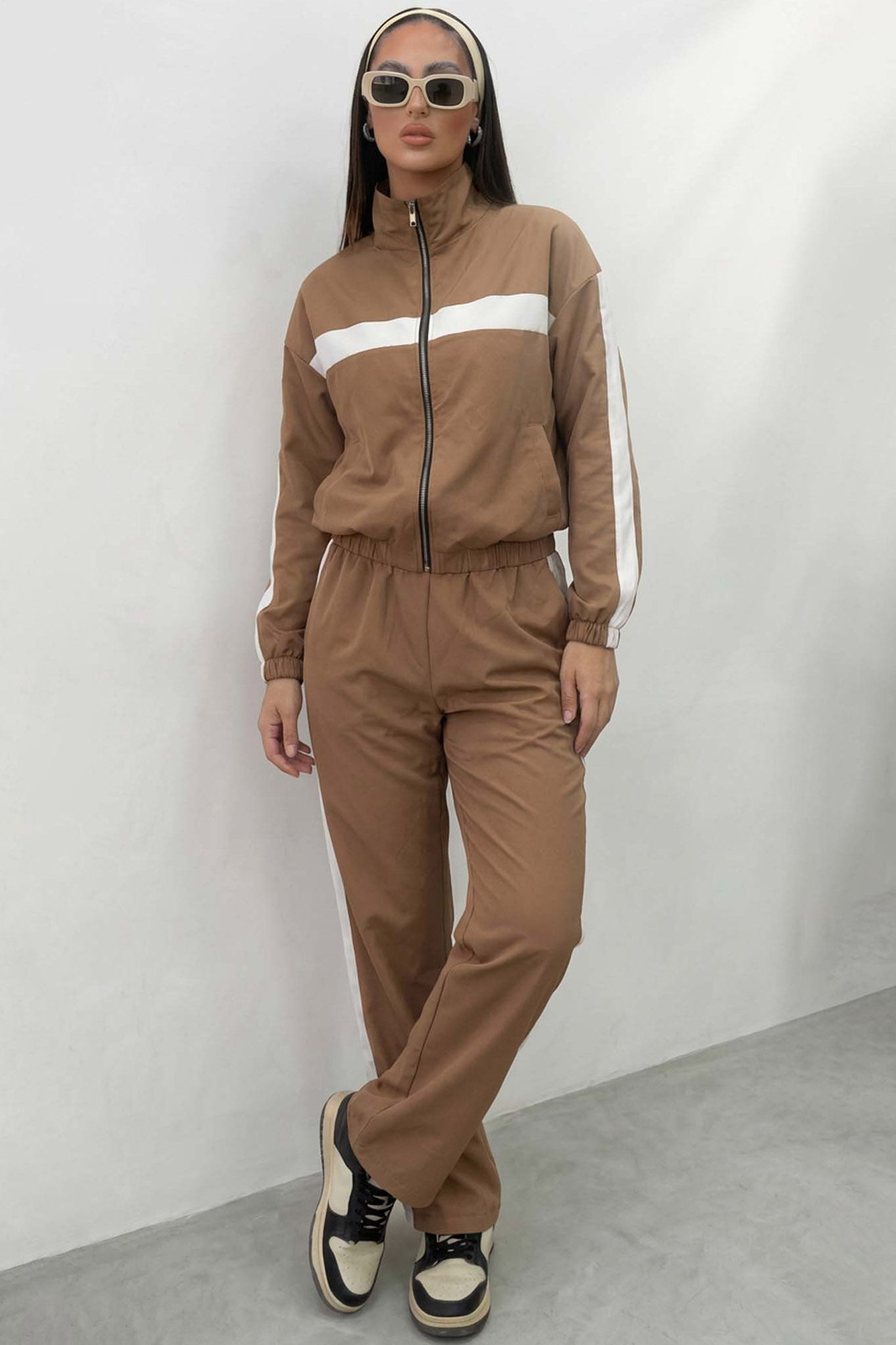 Σετ που συνδυάζει ζακέτα με ψηλό γιακά και άνετο παντελόνι. Διαθέτει κομψές λευκές ρίγες που προσθέτουν μια αθλητική αλλά modern πινελιά, ιδανικό για άνετες και στυλάτες εμφανίσεις όλη τη μέρα.