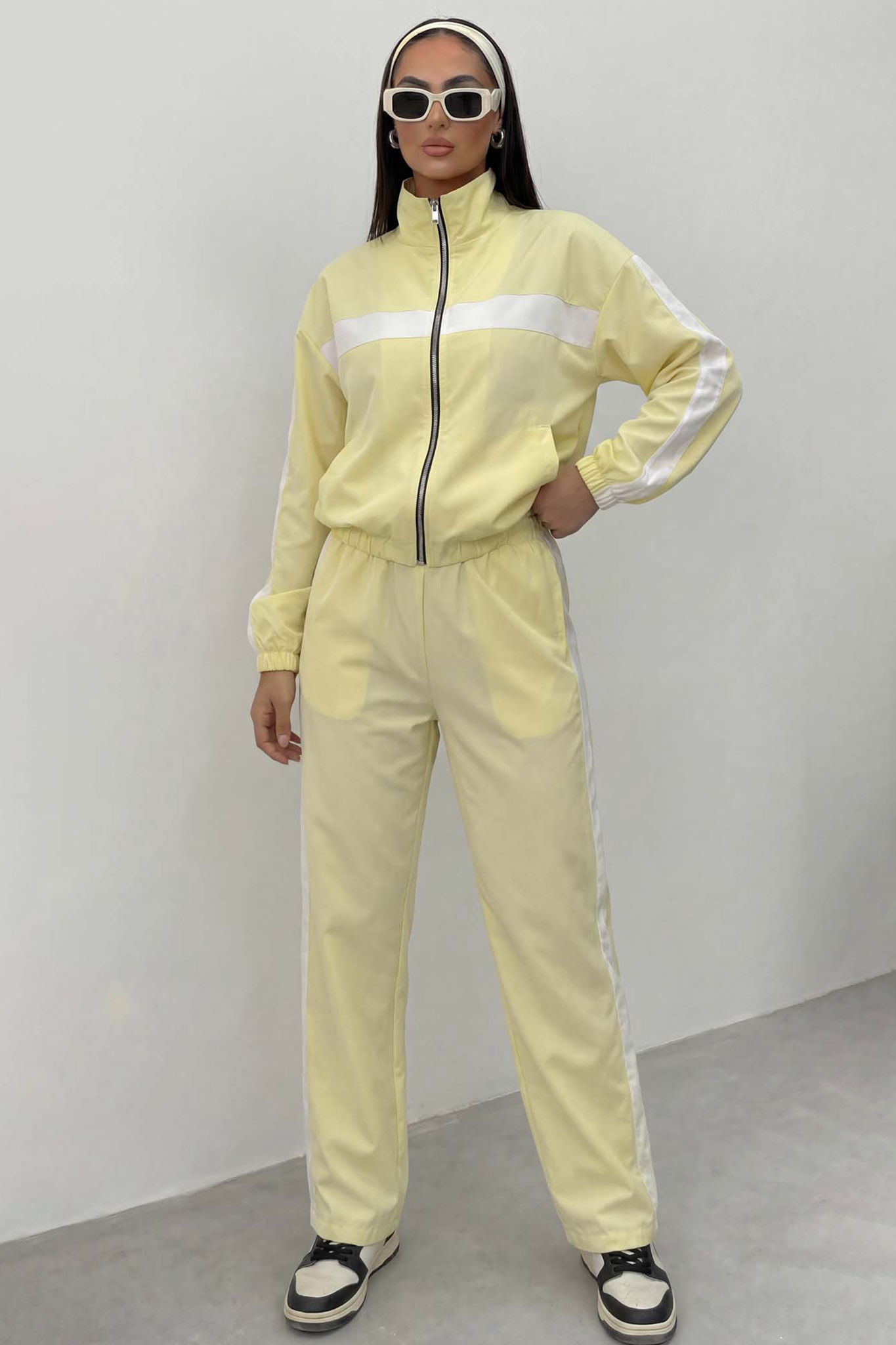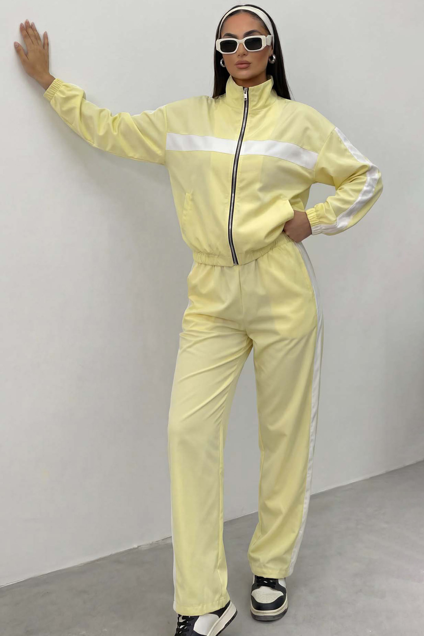 Σετ που συνδυάζει ζακέτα με ψηλό γιακά και άνετο παντελόνι. Διαθέτει κομψές λευκές ρίγες που προσθέτουν μια αθλητική αλλά modern πινελιά, ιδανικό για άνετες και στυλάτες εμφανίσεις όλη τη μέρα.