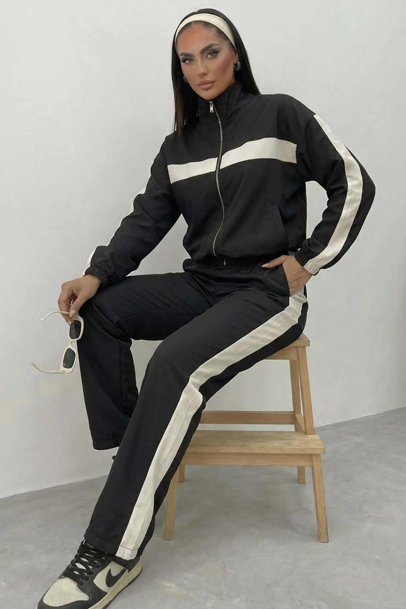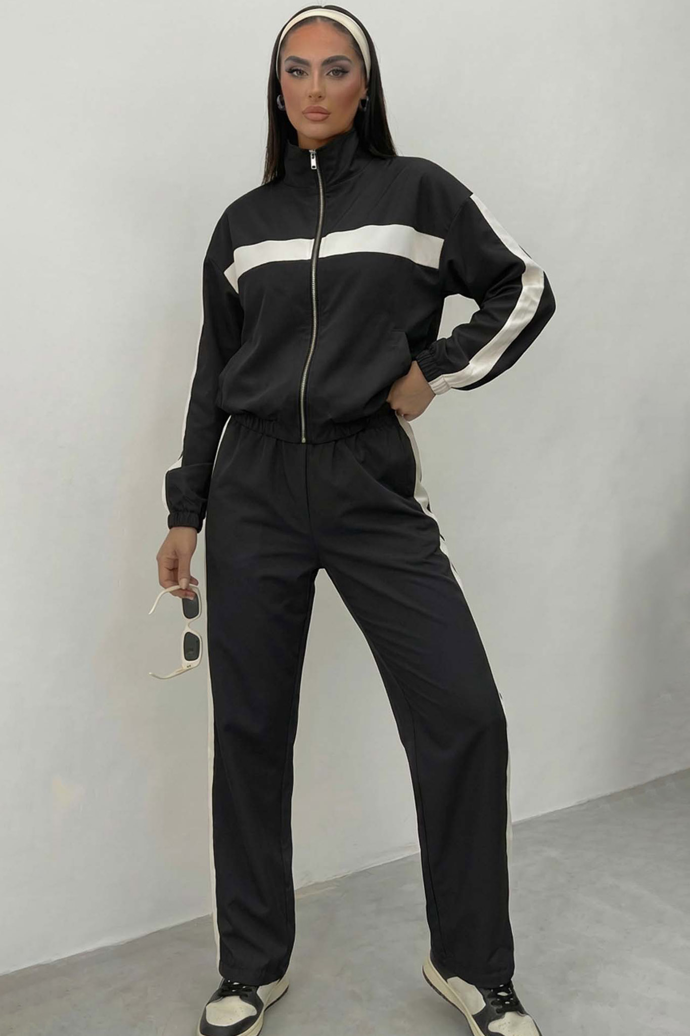 Σετ που συνδυάζει ζακέτα με ψηλό γιακά και άνετο παντελόνι. Διαθέτει κομψές λευκές ρίγες που προσθέτουν μια αθλητική αλλά modern πινελιά, ιδανικό για άνετες και στυλάτες εμφανίσεις όλη τη μέρα.