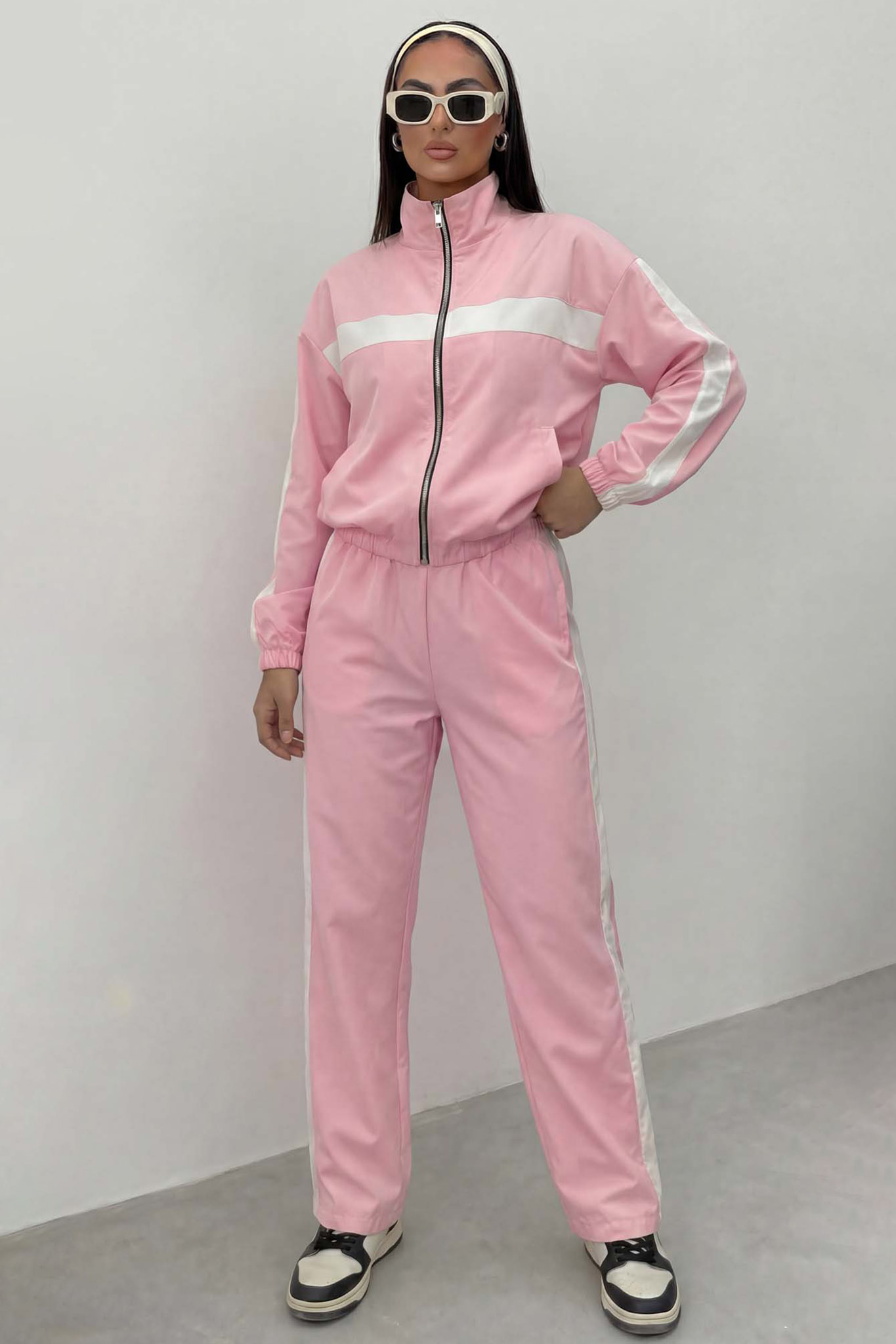 Σετ που συνδυάζει ζακέτα με ψηλό γιακά και άνετο παντελόνι. Διαθέτει κομψές λευκές ρίγες που προσθέτουν μια αθλητική αλλά modern πινελιά, ιδανικό για άνετες και στυλάτες εμφανίσεις όλη τη μέρα.