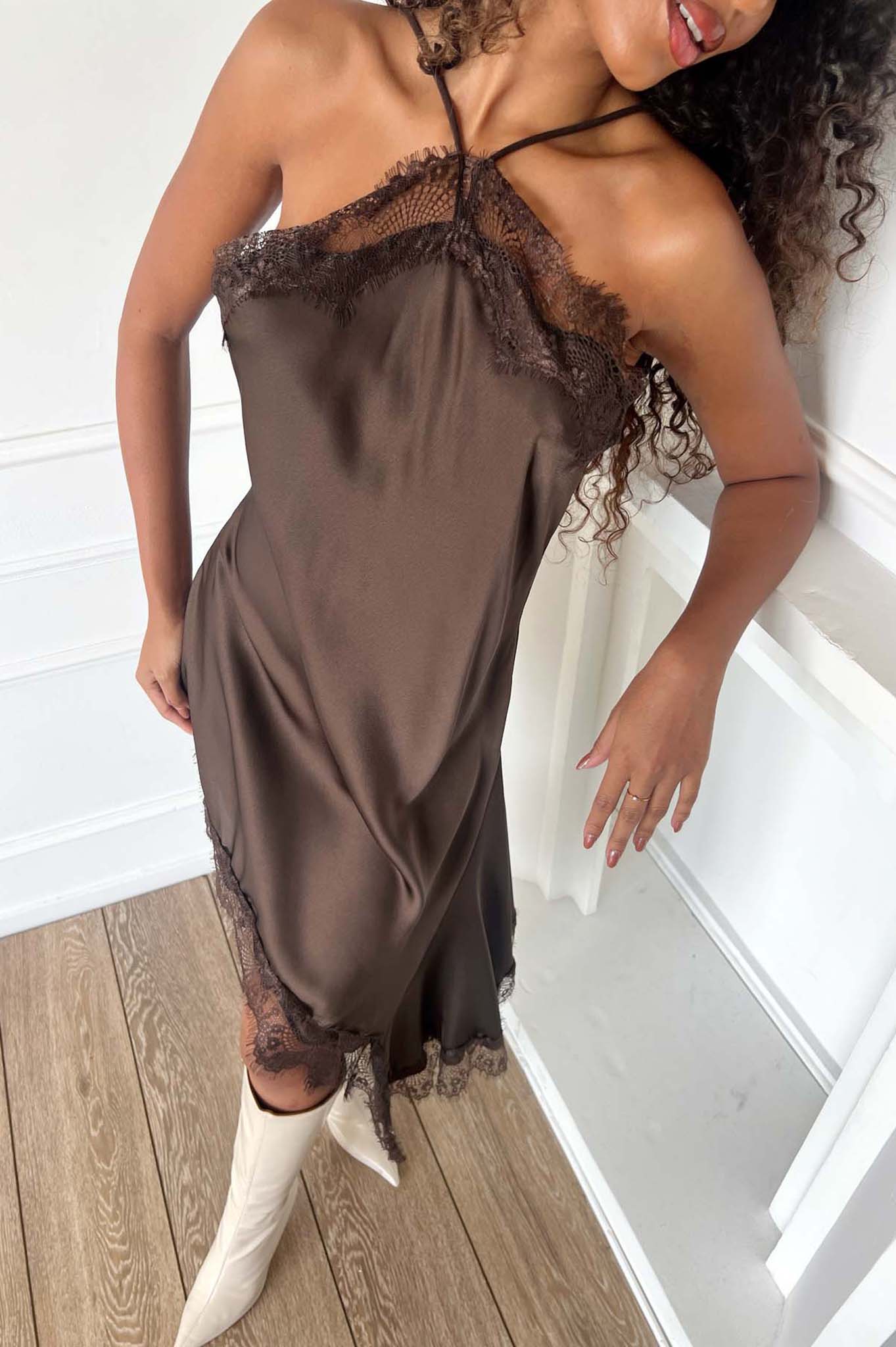 Enzoσατέν φόρεμα με δαντέλα καφέ
