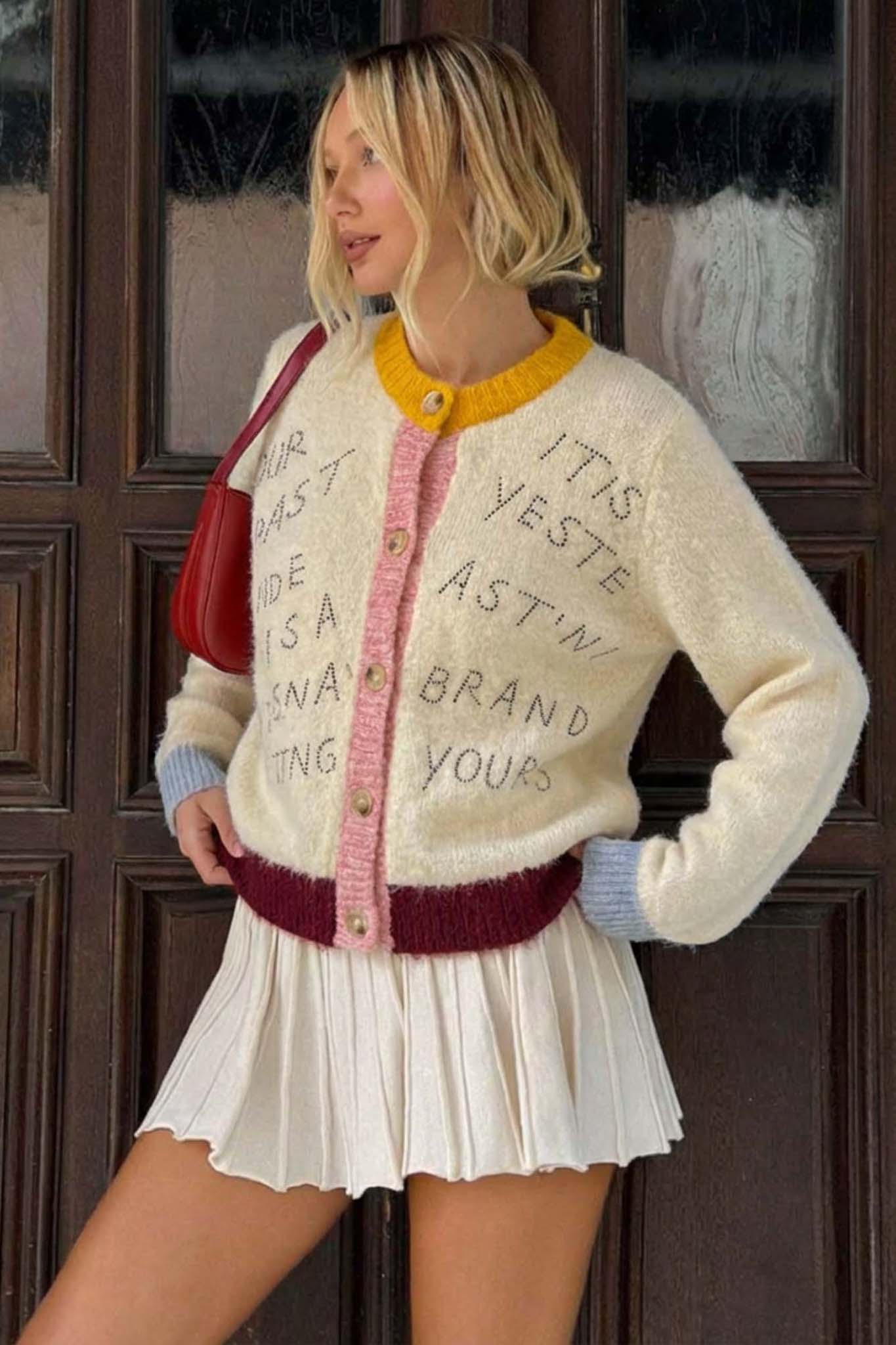 Ζεστή και στιλάτη γυναικεία ζακέτα με απαλή υφή, με πολύχρωμες λεπτομέρειες. Διαθέτει κίτρινο γιακά, ροζ πατιλέτα με κουμπιά, μπορντό τελείωμα στη μέση και γαλάζιες μανσέτες. Στο μπροστινό μέρος φέρει κεντημένο κείμενο για μοντέρνα και ιδιαίτερη εμφάνιση. Ιδανική για καθημερινές εμφανίσεις, συνδυάζεται εύκολα με φούστες ή παντελόνια για ένα cozy και fashion-forward look.