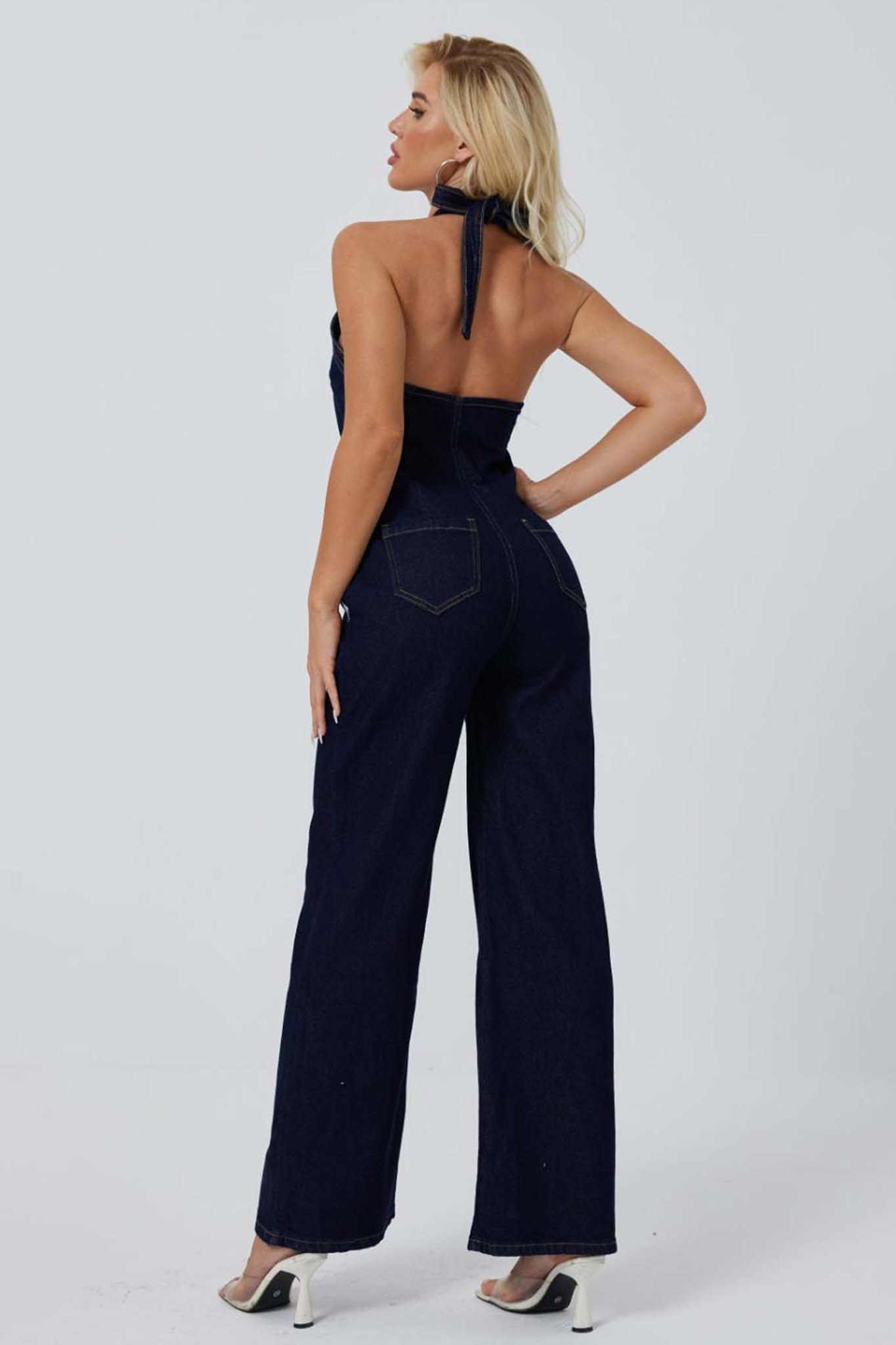 Τζιν ολόσωμη φόρμα που διαθέτει εξώπλατο σχεδιασμό με δέσιμο στον λαιμό που αναδεικνύει τους ώμους και την πλάτη.