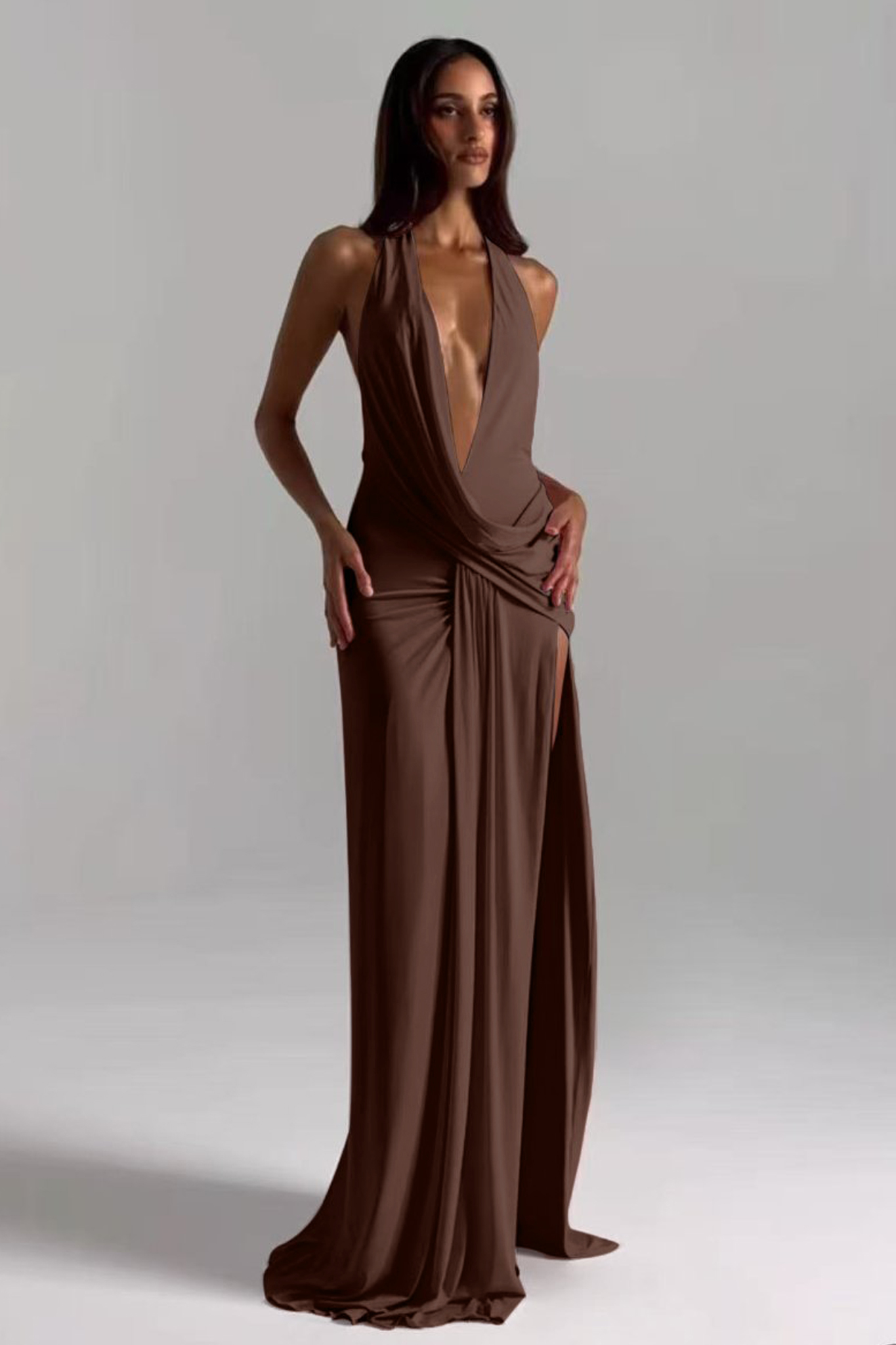 Μάξι φόρεμα με σκίσιμο στο πλάι και ανοιχτή πλάτη.