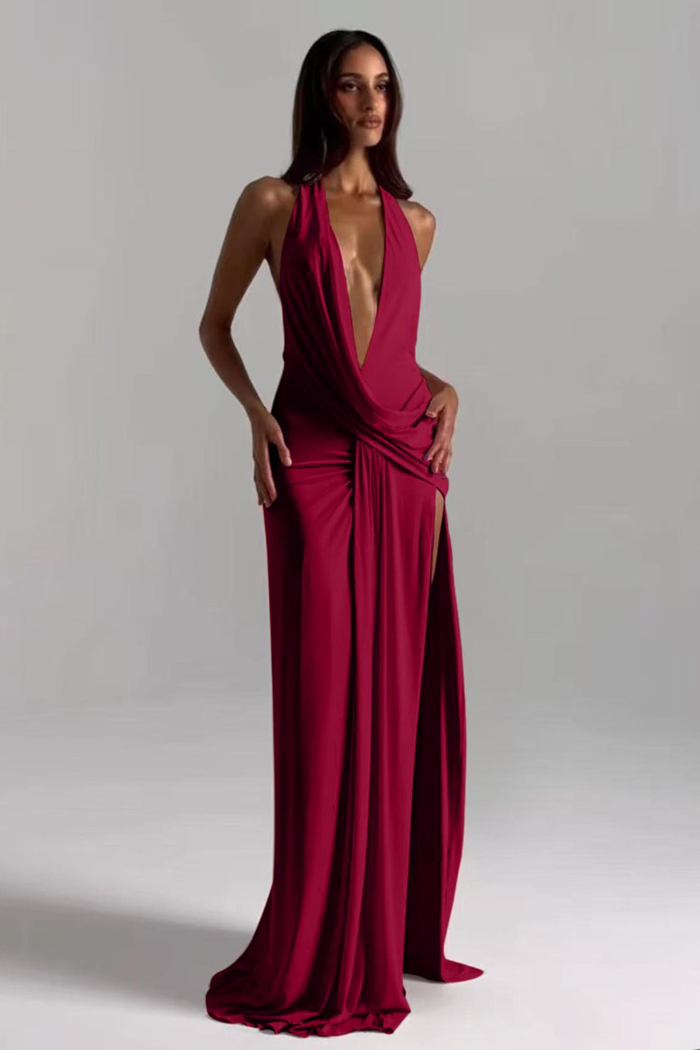 Μάξι φόρεμα με σκίσιμο στο πλάι και ανοιχτή πλάτη.