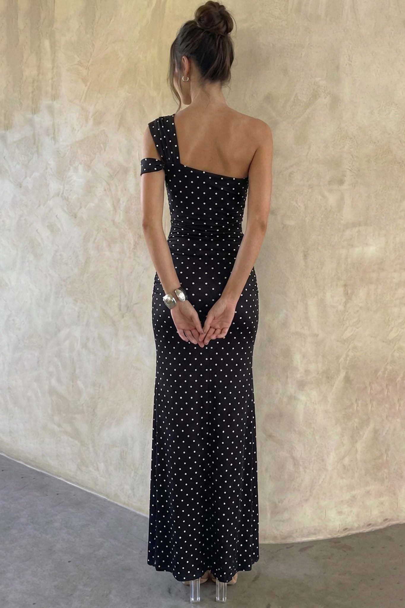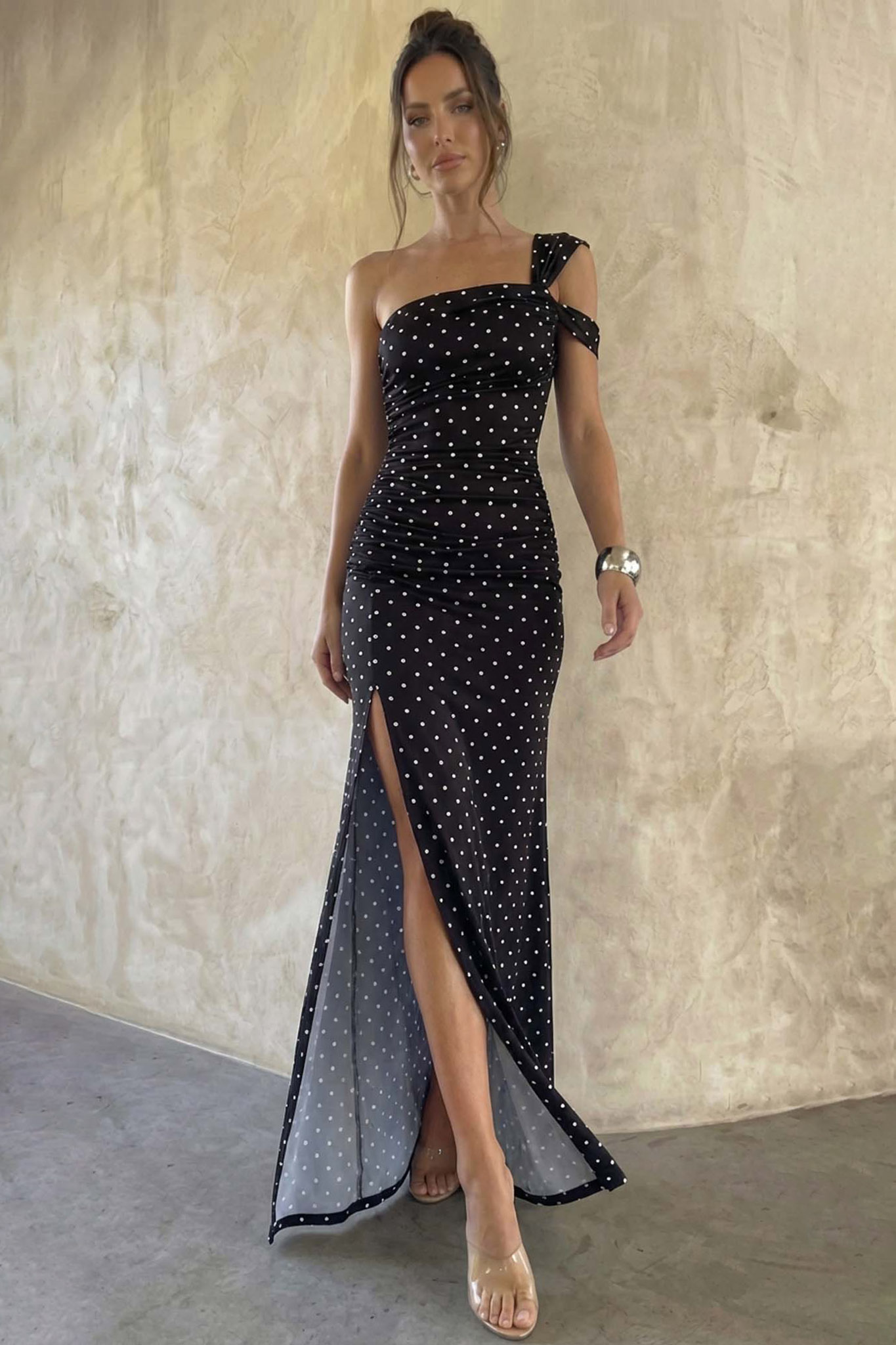 Μaxi φόρεμα με πουά μοτίβο και ασύμμετρο σχέδιο στον έναν ώμο. Διαθέτει κομψές σούρες στον κορμό που κολακεύουν τη σιλουέτα και ένα εντυπωσιακό, ψηλό σκίσιμο στο πλάι που ξεκινά από το ύψος του μηρού. Μήκος 135cm, στήθος 40cm.