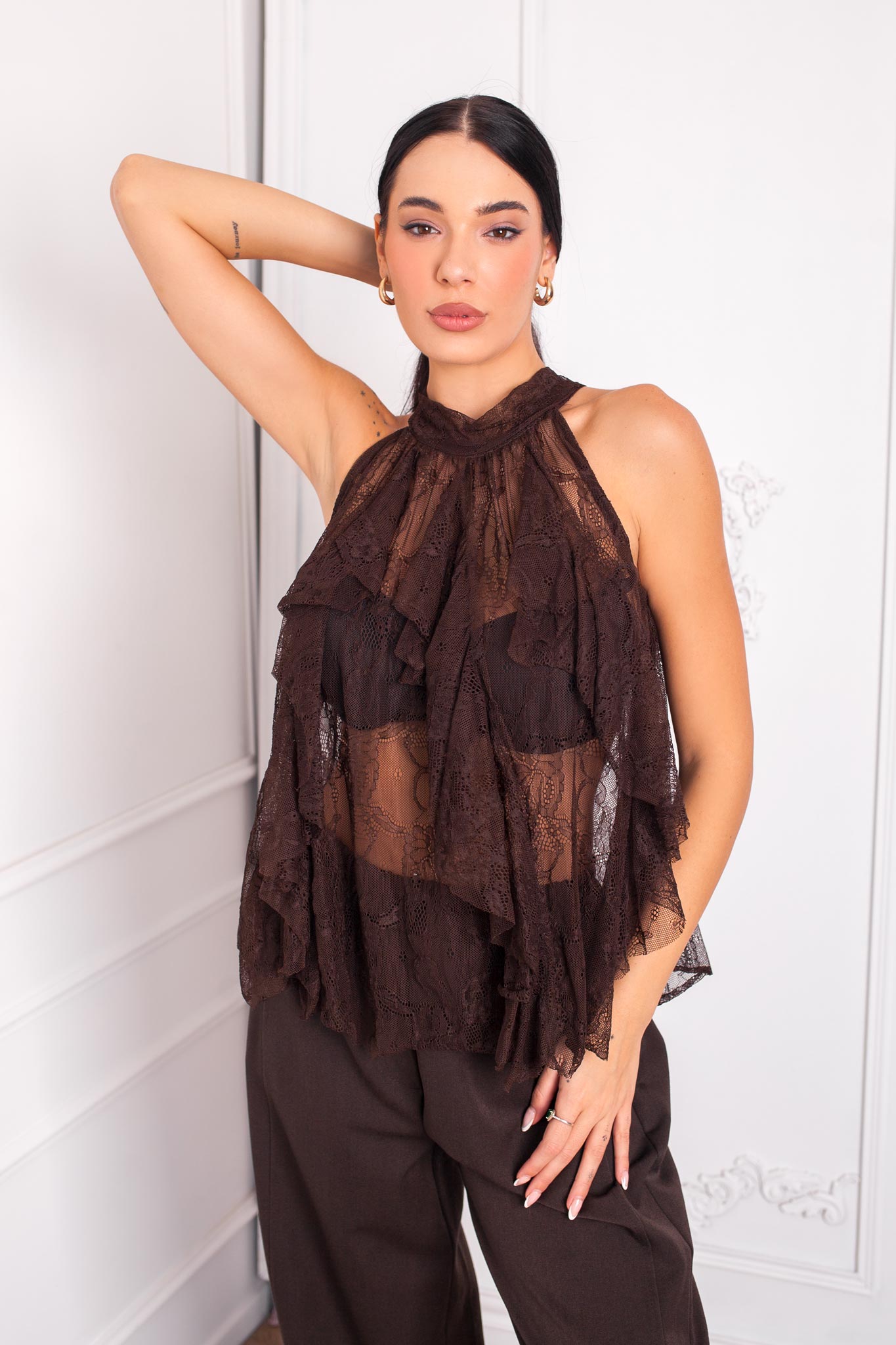 Euniceμπλούζα με δαντέλα καφέ