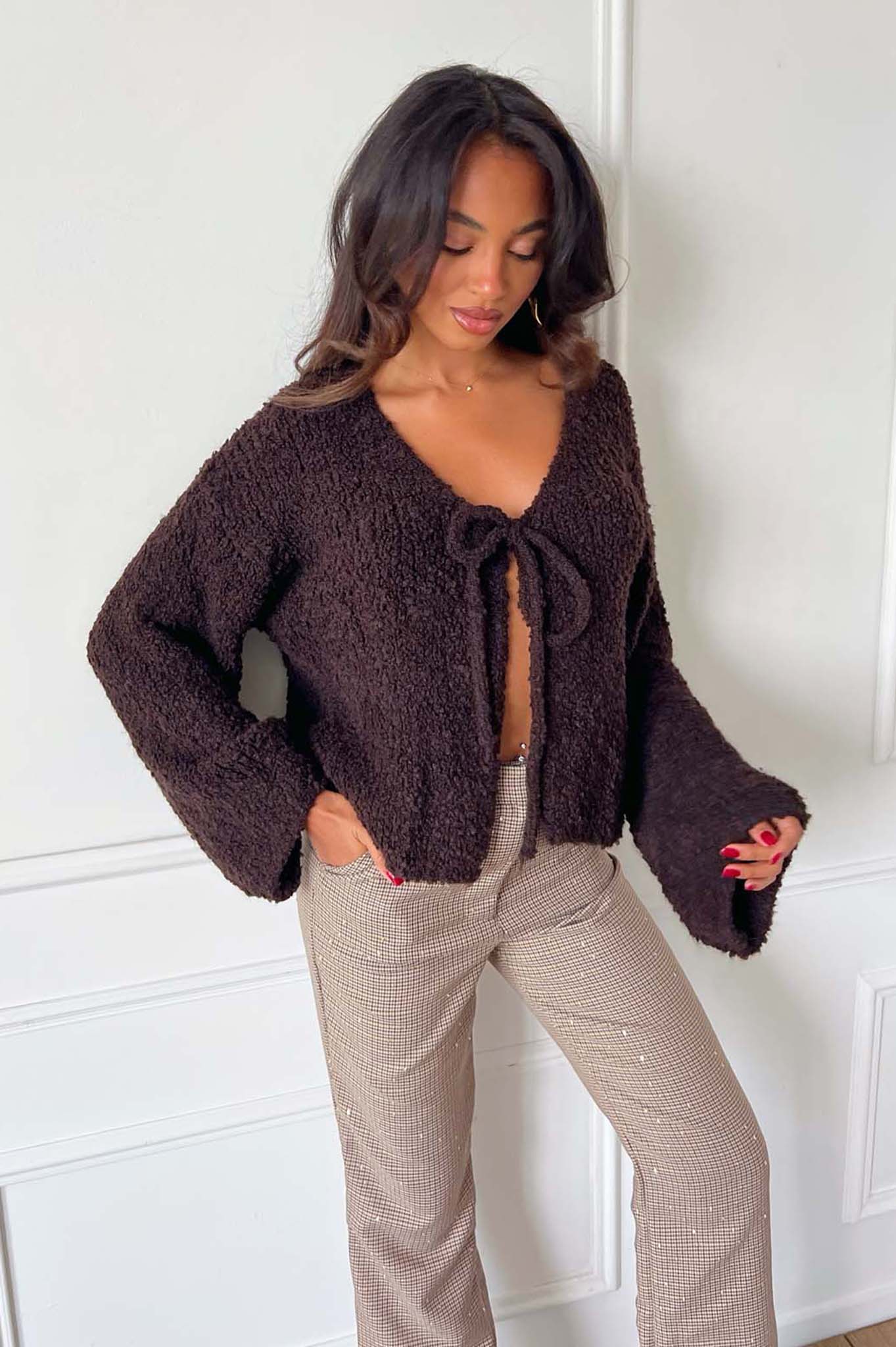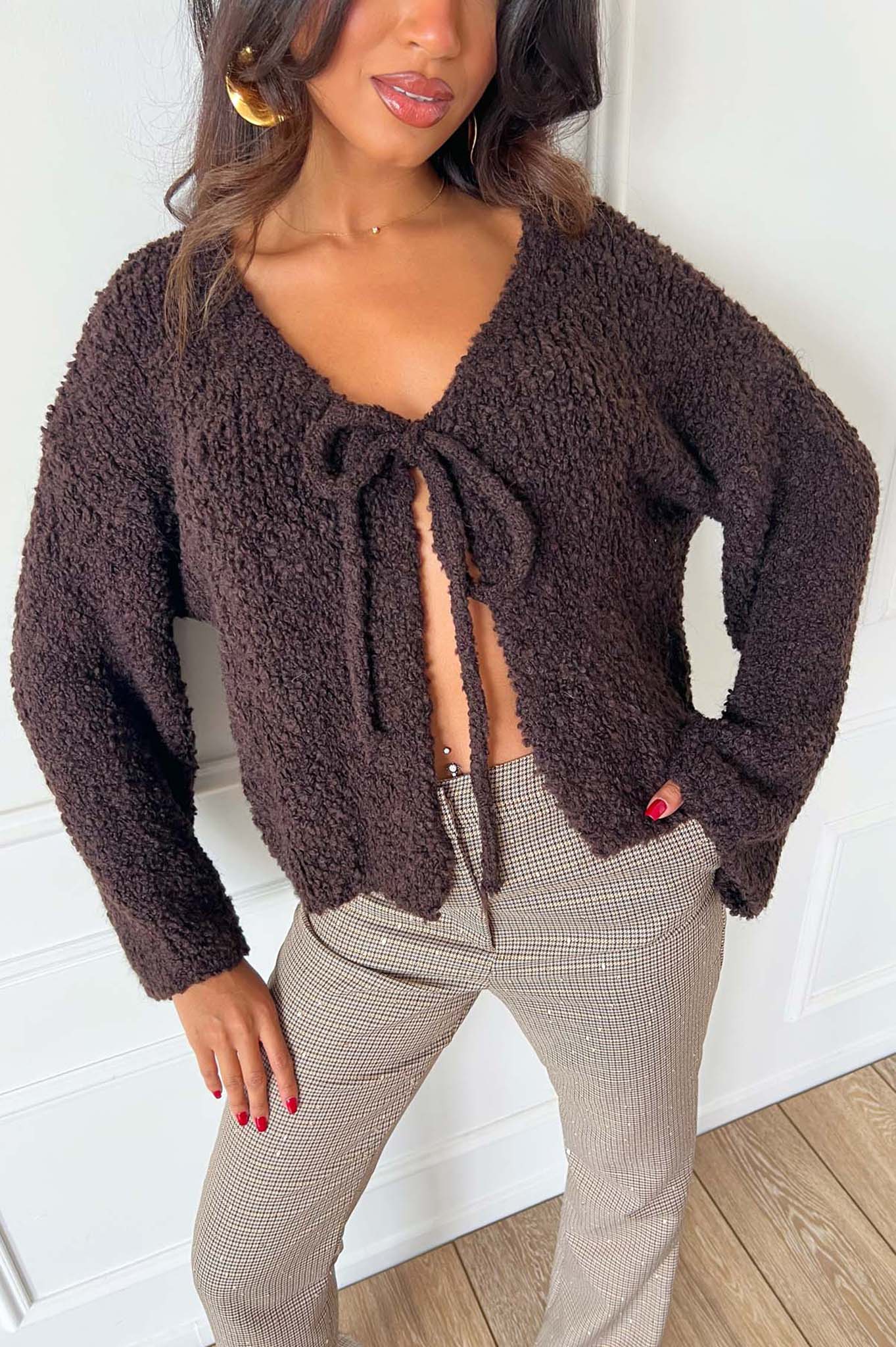 Πλεκτή ζακέτα cozy με κορδόνια μπροστά για να δένει. Μήκος 62cm, Στήθος 65cm, Mανίκι 55cm