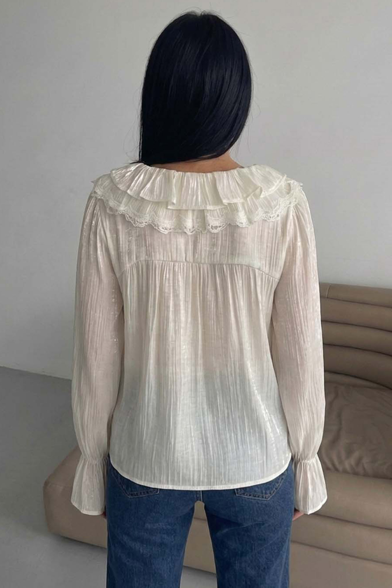 Πουκάμισο με γυαλιστερή όψη, βολάν στον γιακά και ιδιαίτερη λεπτομέρεια στα μανίκια που προσδίδουν μια πιο εκλεπτισμένη εμφάνιση.