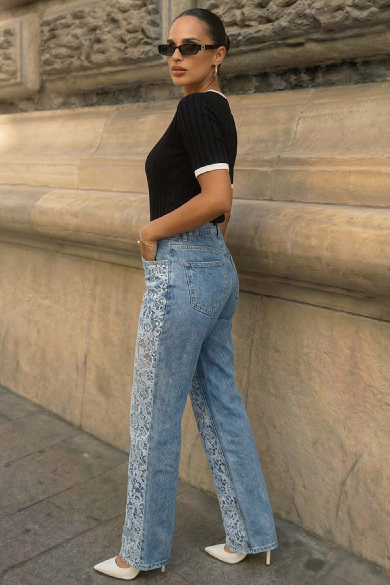 Ψηλόμεσο wide-leg παντελόνι αποτελεί ένα statement κομμάτι που συνδυάζει την denim αισθητική με τη ρομαντική δαντέλα. Ο μοναδικός σχεδιασμός με το floral δαντελωτό κέντημα στα μπατζάκια προσφέρει μια ημιδιαφανή και αέρινη αίσθηση, ιδανική για να ξεχωρίζεις σε κάθε σου εμφάνιση.
