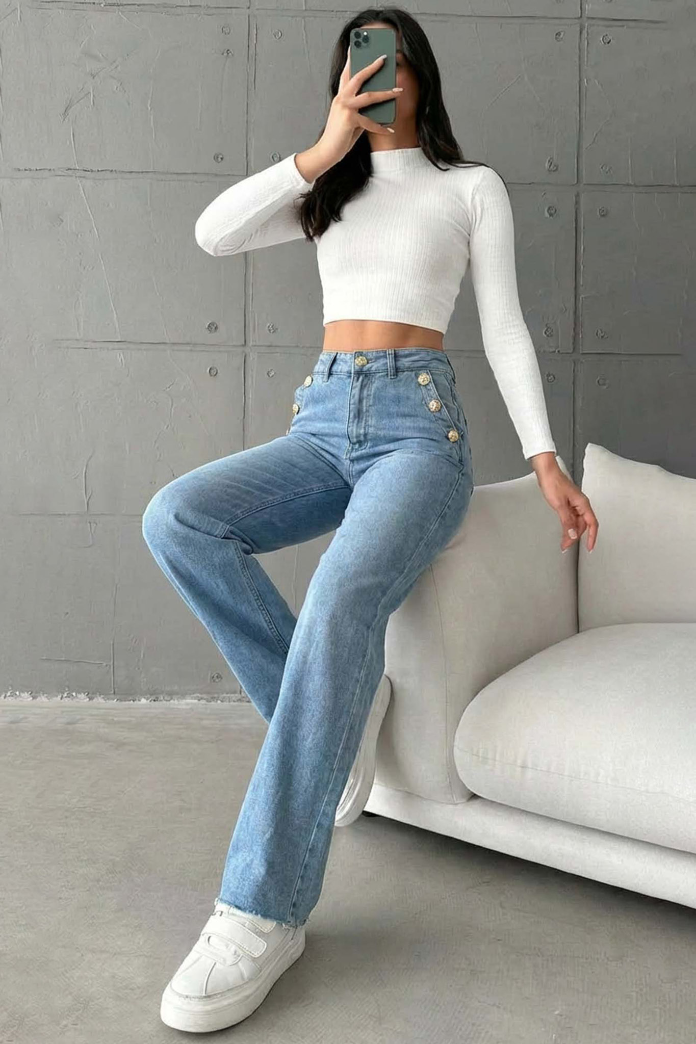 Fantinψηλόμεσο τζιν με χρυσά κουμπία στο πλάι μπλε