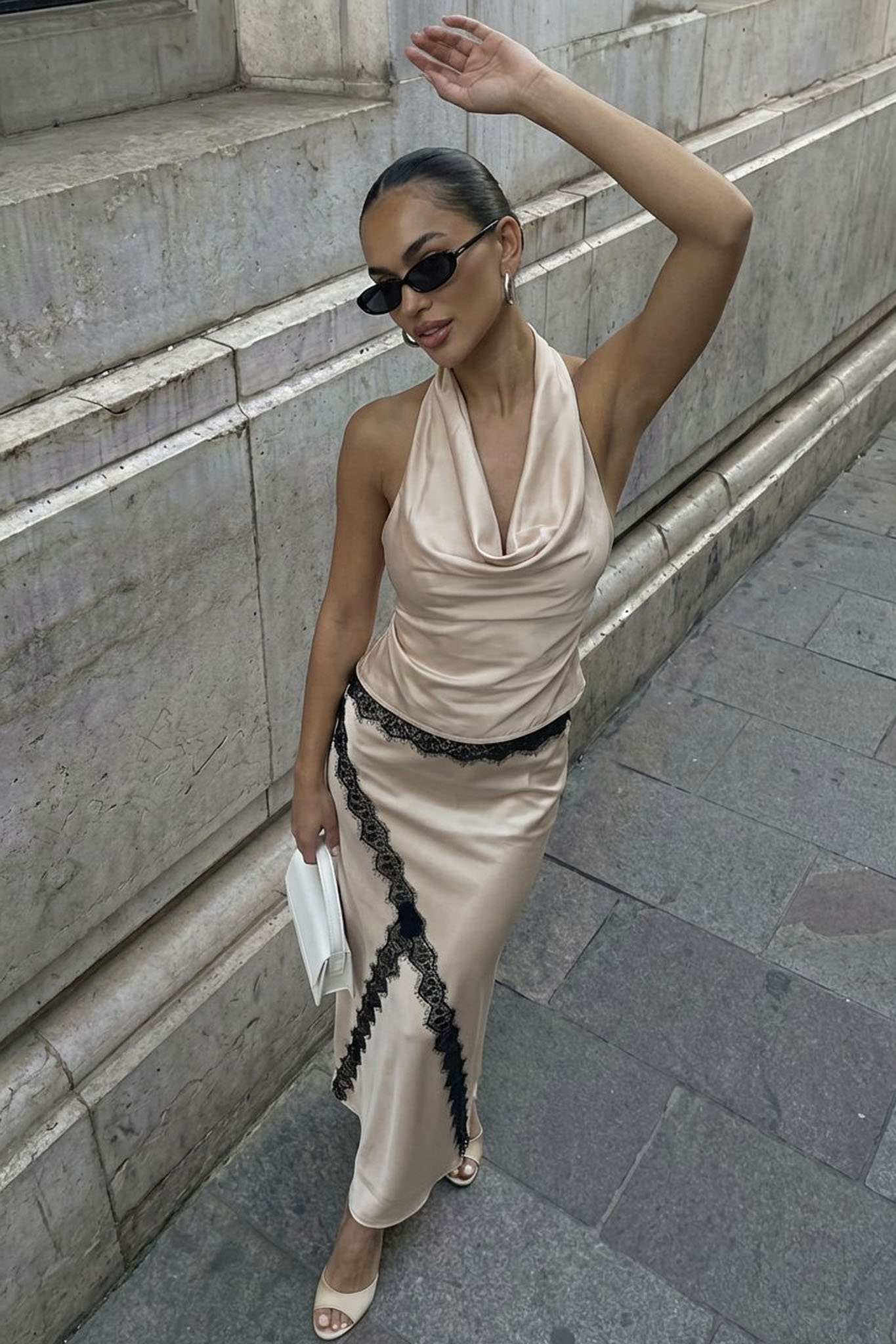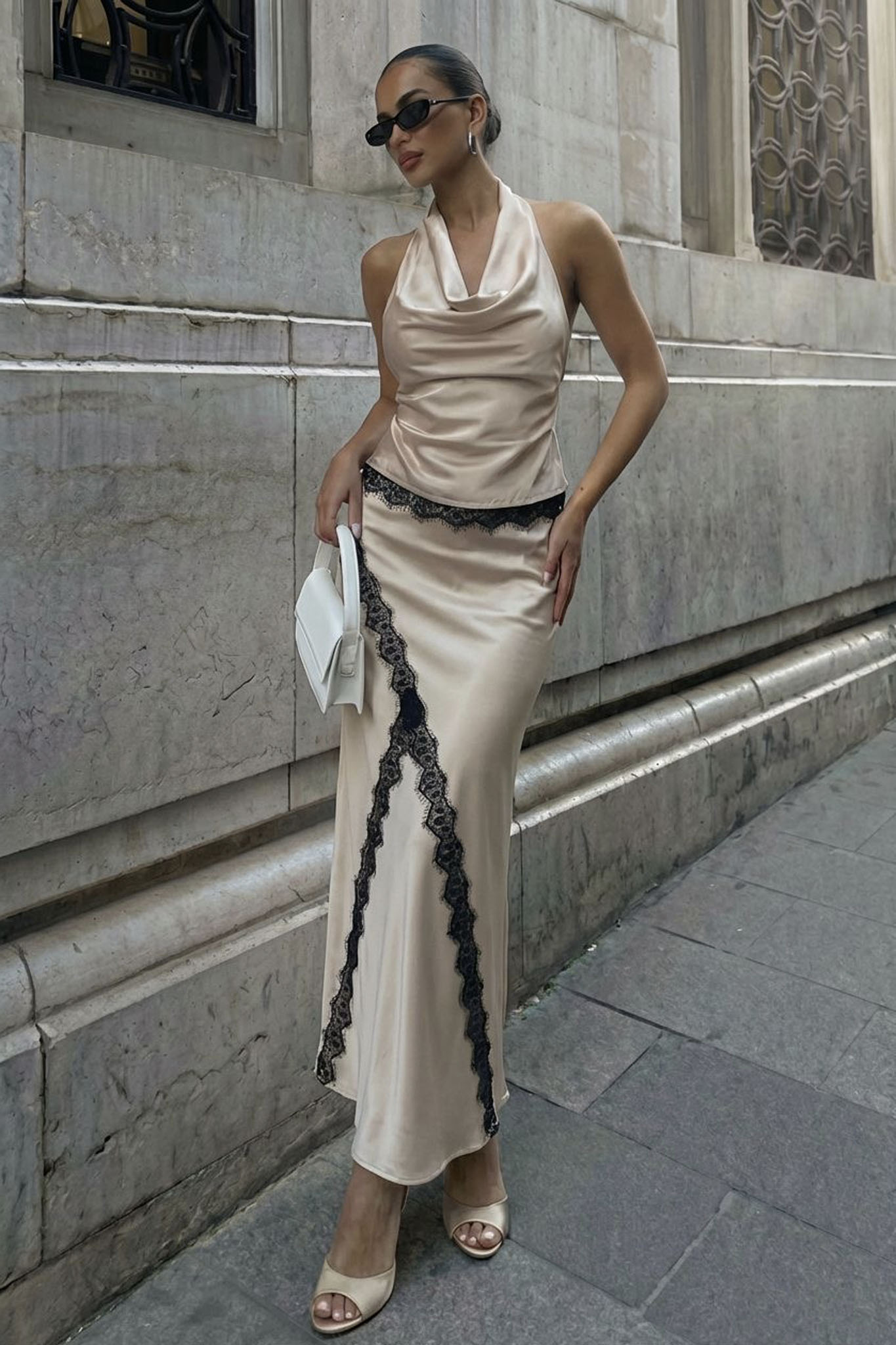 Farisσατέν τοπ φούστα με λεπτομέρειες δαντέλα μπεζ