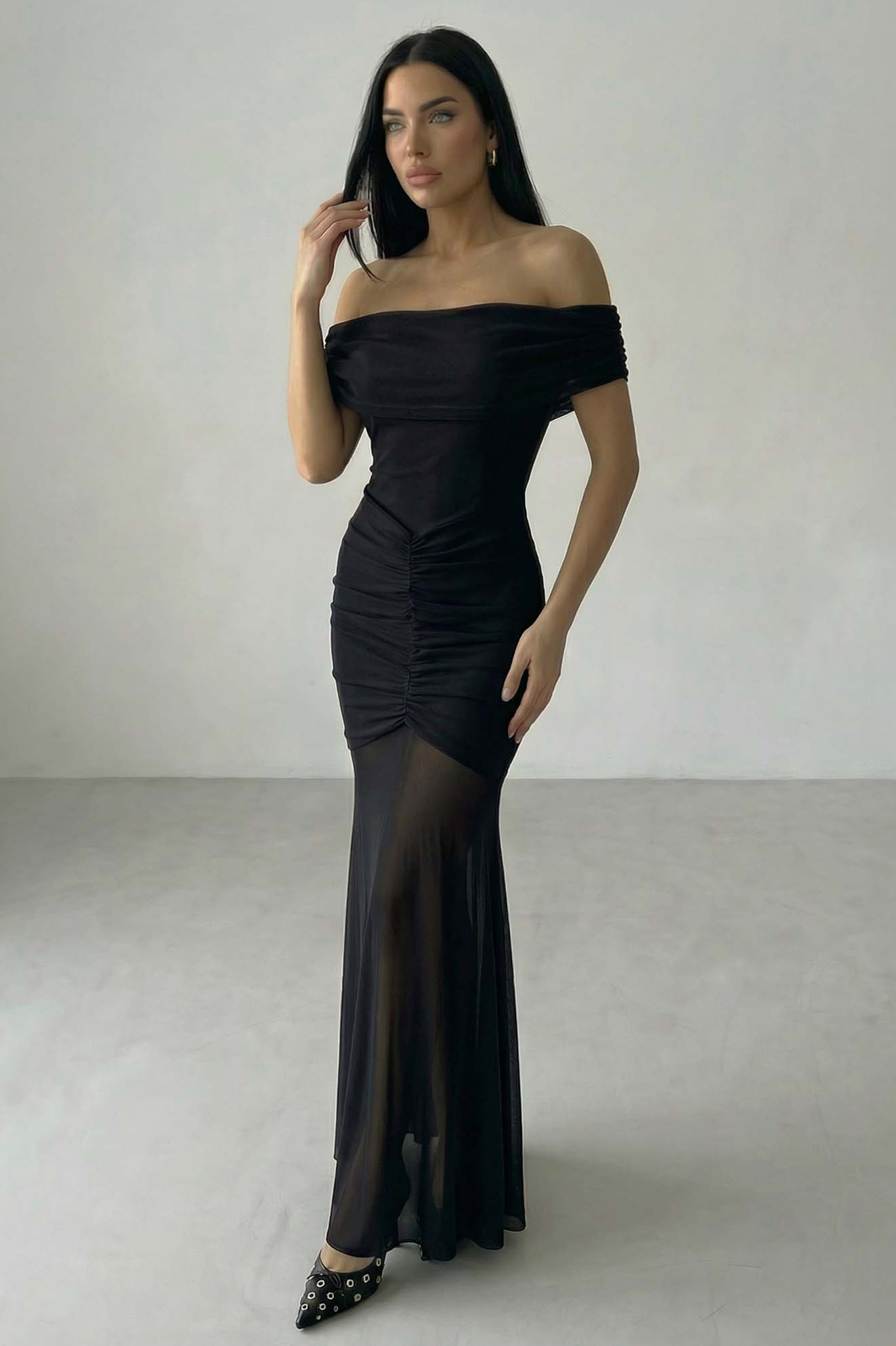 Μακρύ φόρεμα με ελεύθερους ώμους, εφαρμοστό με σούρα και διαφάνεια στο κάτω μέρος. Διαθέτει τιράντες και το τούλι στους ώμους είναι αποσπώμενο. Μήκος 140cm Στήθος 40cm.