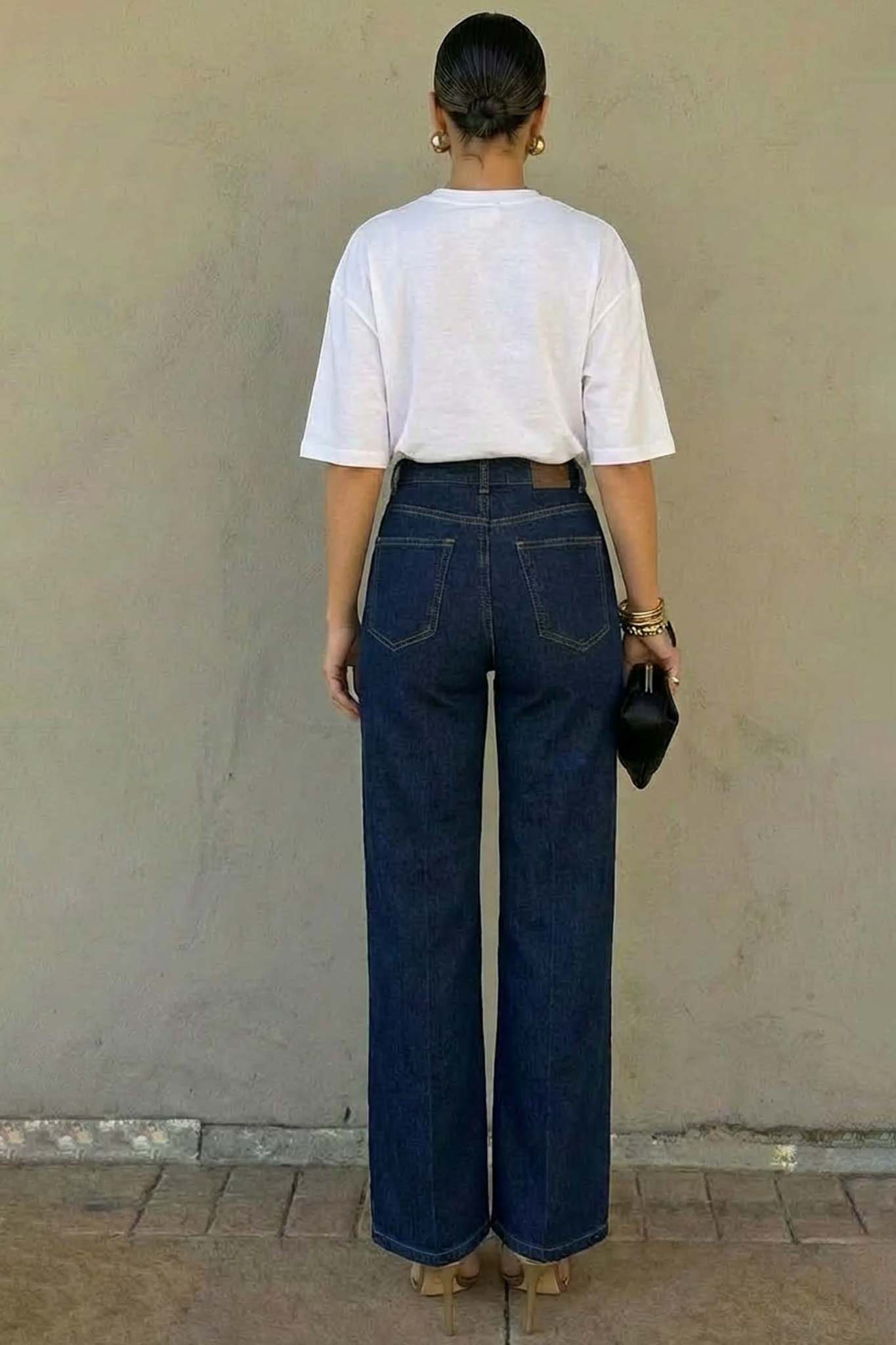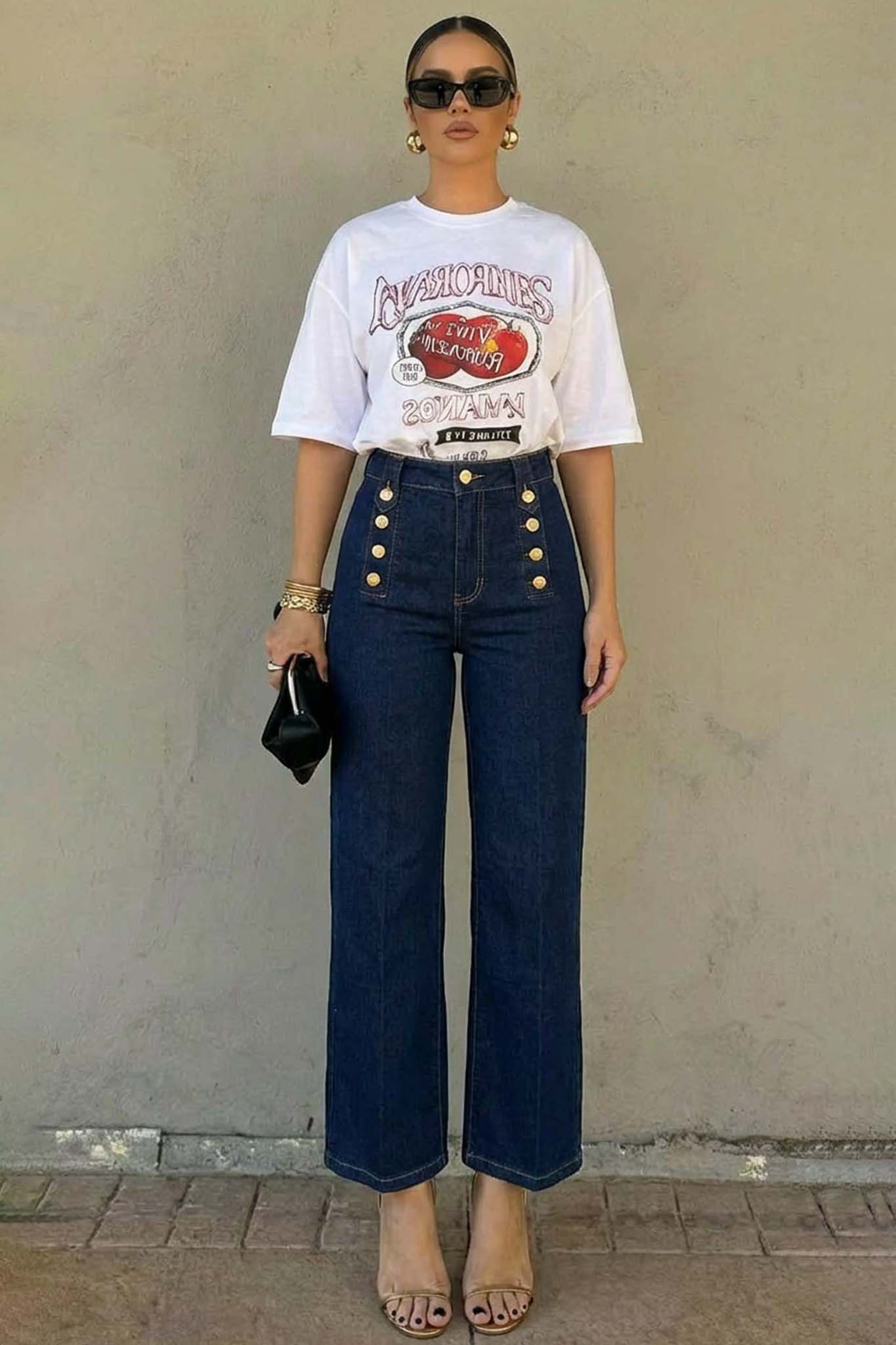 Τζιν με ψηλή μέση, ίσια γραμμή και ορατά χρυσά κουμπιά στο μπροστινό μέρος, σε ναυτικό στυλ. Είναι κατασκευασμένο από σκούρο τζιν ύφασμα και διαθέτει πλαϊνές και πίσω τσέπες.