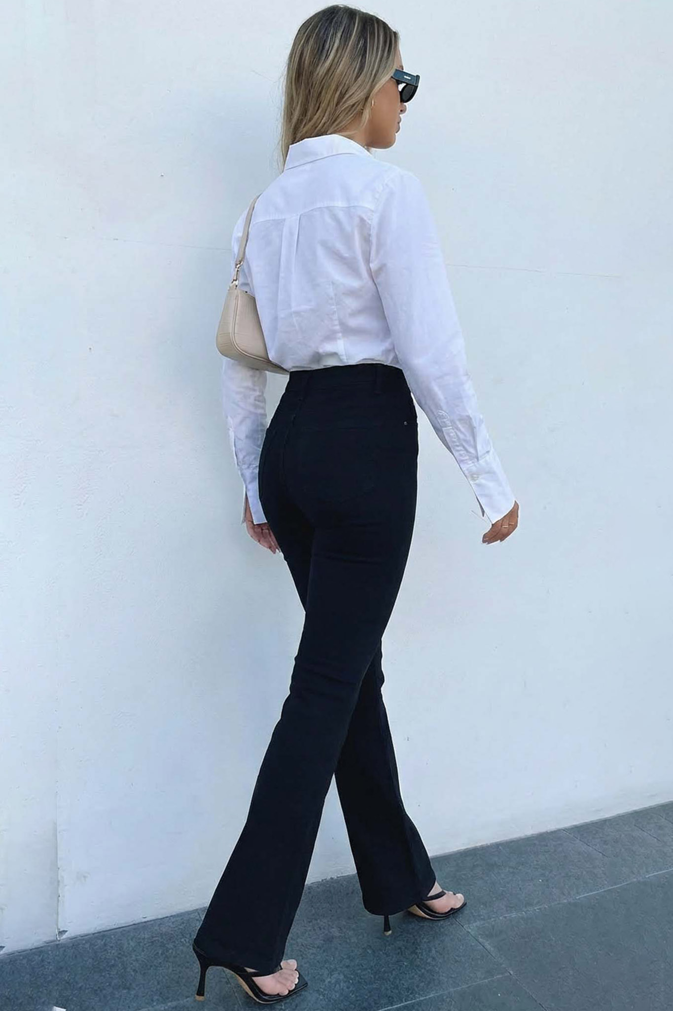 Ψηλόμεσο Τζιν Παντελόνι Καμπάνα. Αναδείξτε τη σιλουέτα σας με αυτό το απόλυτα θηλυκό μαύρο τζιν καμπάνα. Ο συνδυασμός της ψηλόμεσης εφαρμογής με το σταδιακό άνοιγμα στο κάτω μέρος (flare cut) δημιουργεί ένα εφέ επιμήκυνσης των ποδιών, προσφέροντας ένα κομψό και δυναμικό στυλ.