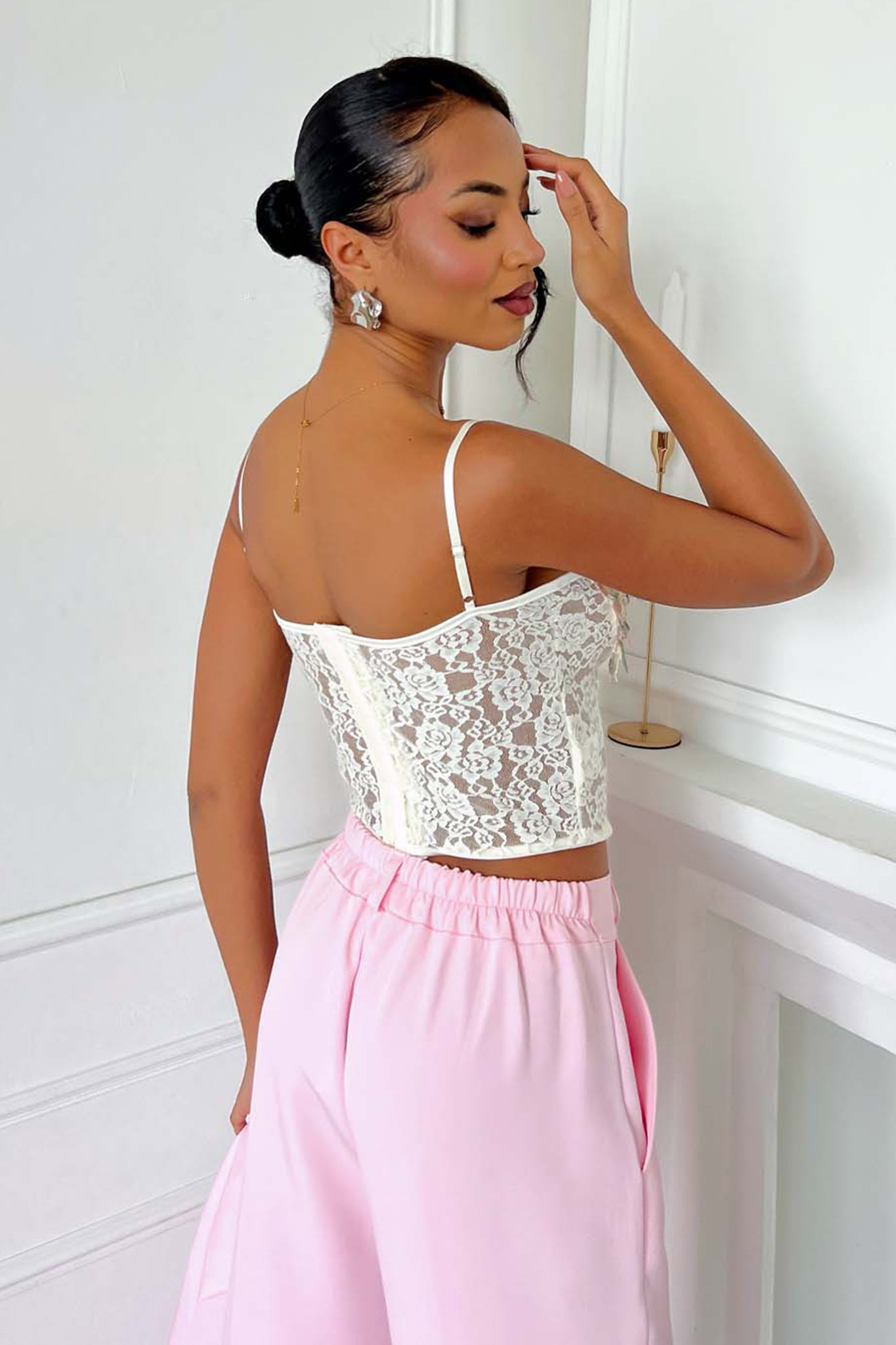 Κορσές από διάφανη δαντέλα με ανάγλυφα λουλούδια, λεπτές τιράντες και sweetheart λαιμόκοψη. Σχεδιασμένος για σταθερή εφαρμογή και σμίλευση του σώματος.