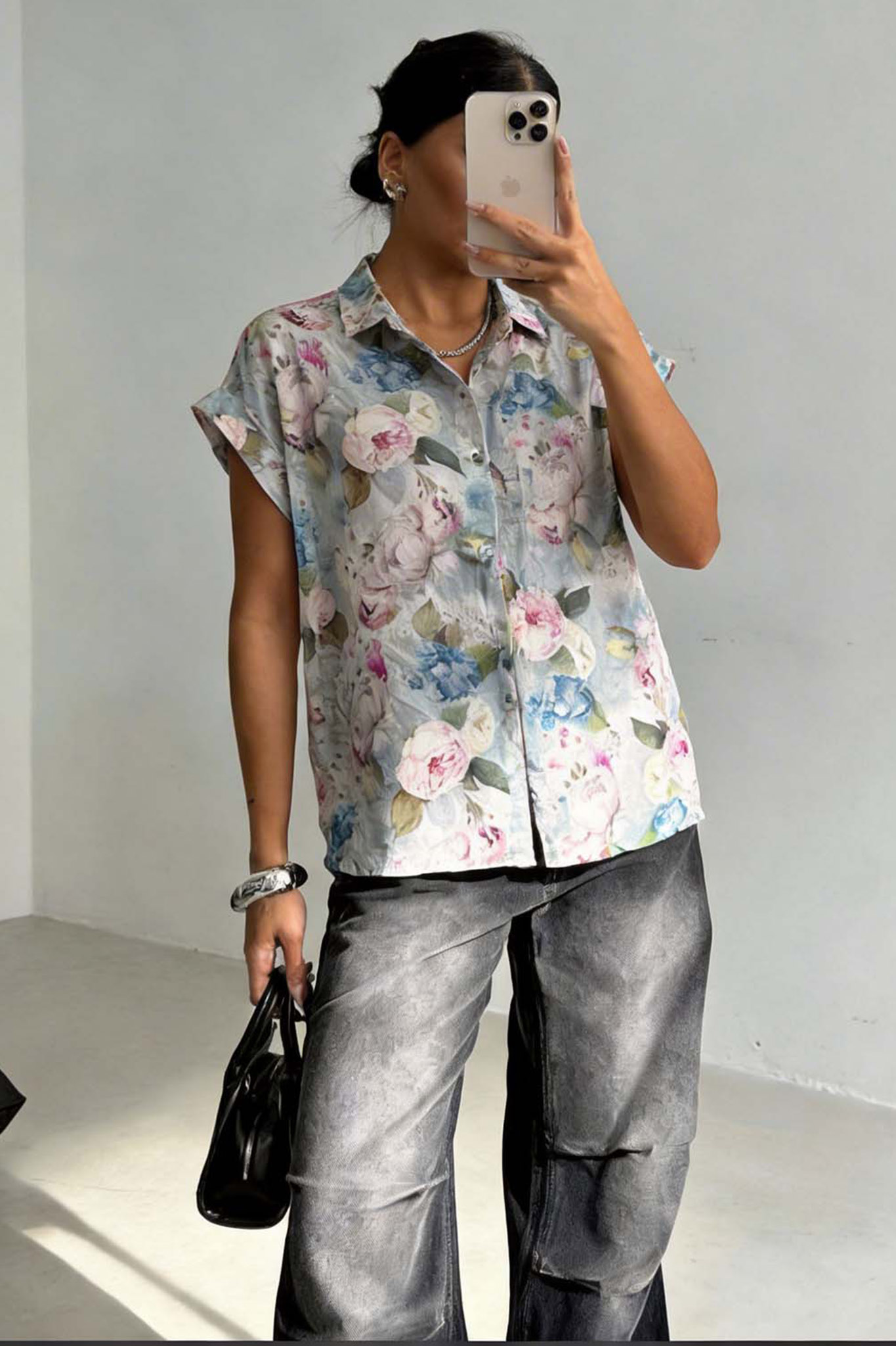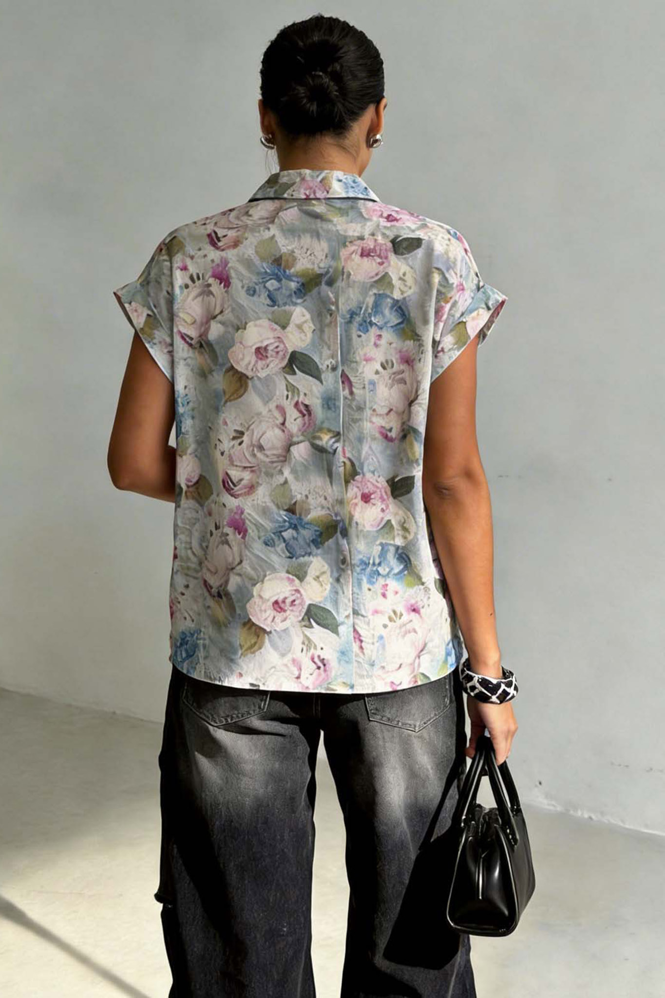 Φλοράλ πουκάμισο κοντομάνικο με δέσιμο στο τελείωμα. Μήκος 62cm, στήθος 114cm