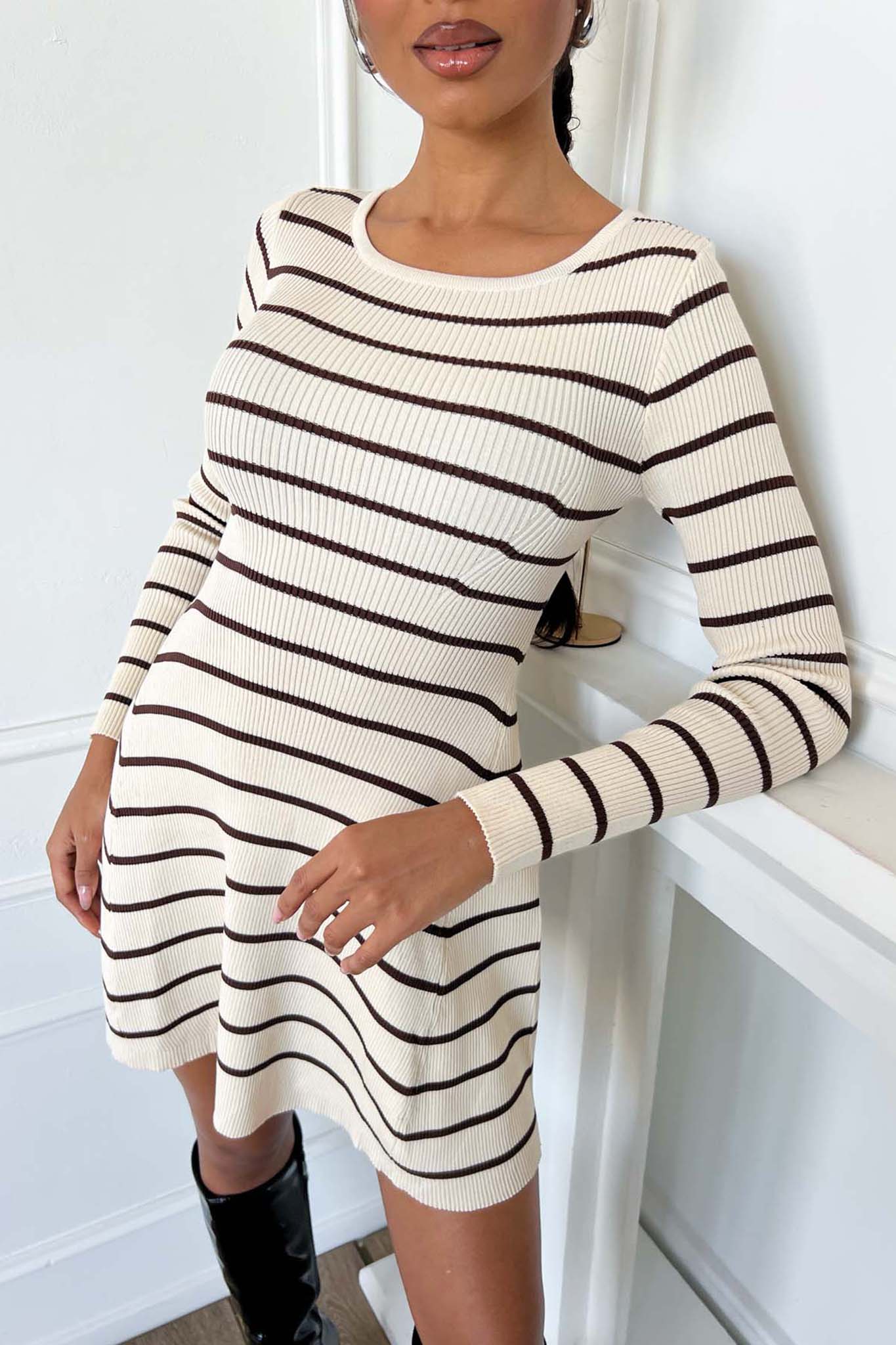 Ριγέ μπεζ φόρεμα μακρυμάνικο για casual εμφανίσεις. Μήκος 79cm, μανίκι 58cm.