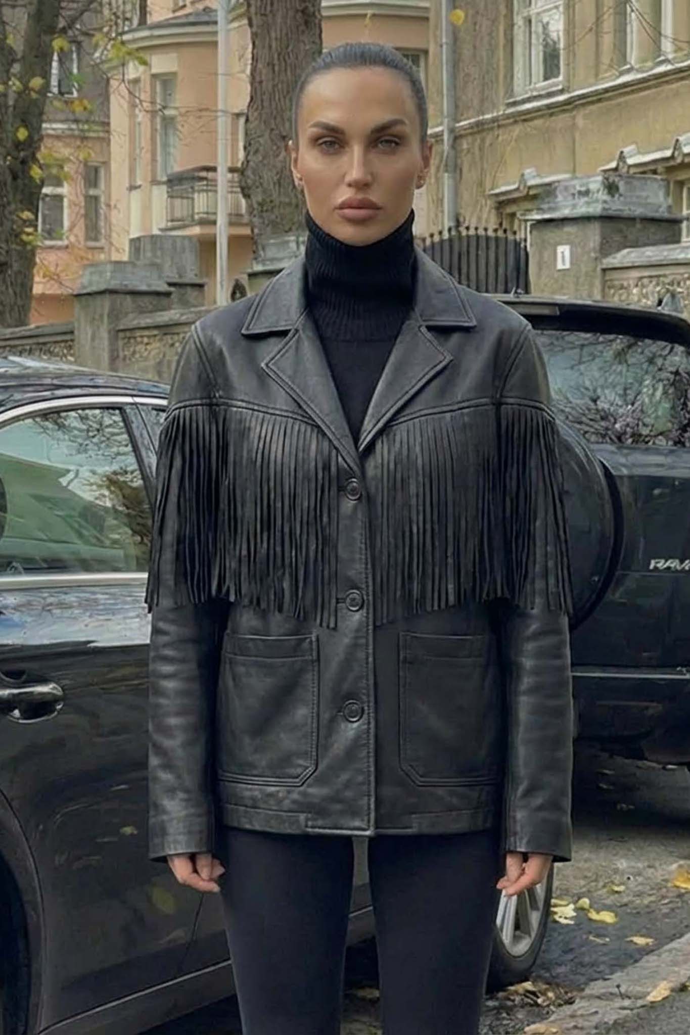 Αναδείξτε το στυλ σας με αυτό το εντυπωσιακό μαύρο δερμάτινο μπουφάν με κρόσσια. Διαθέτει κλασικό γιακά, κλείσιμο με κουμπιά και δύο πρακτικές μπροστινές τσέπες. Τα κρόσσια που διακοσμούν το στήθος και την πλάτη προσθέτουν μια δυναμική western πινελιά, ενώ η άνετη γραμμή του το καθιστά ιδανικό για καθημερινές και βραδινές εμφανίσεις.