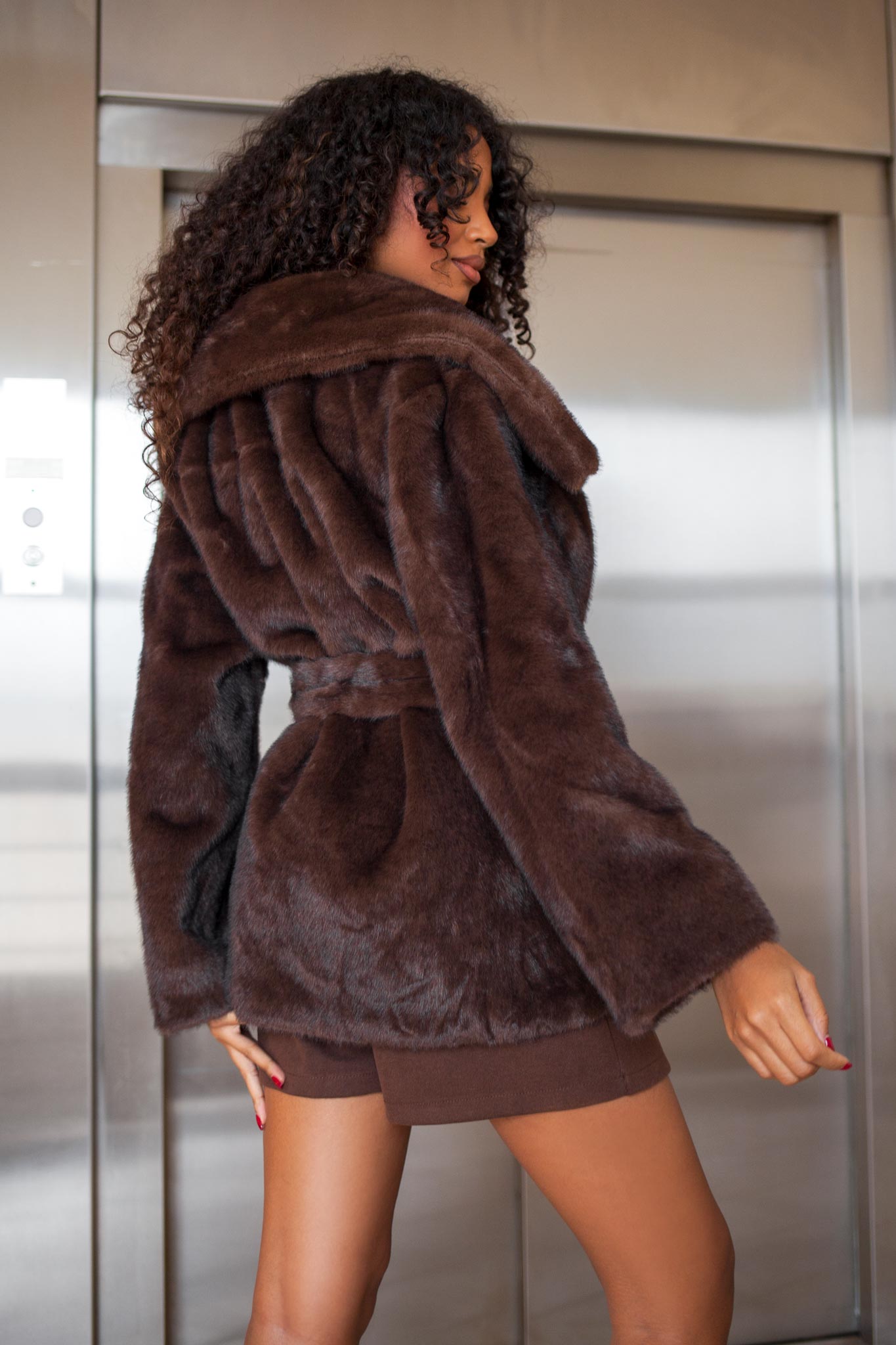 Οικολογική γούνα με δέσιμο στην μέση , κολακεύει το σώμα και προστατεύει από το κρύο. Μήκος 72cm,στήθος 100cm,μανίκι 60cm.