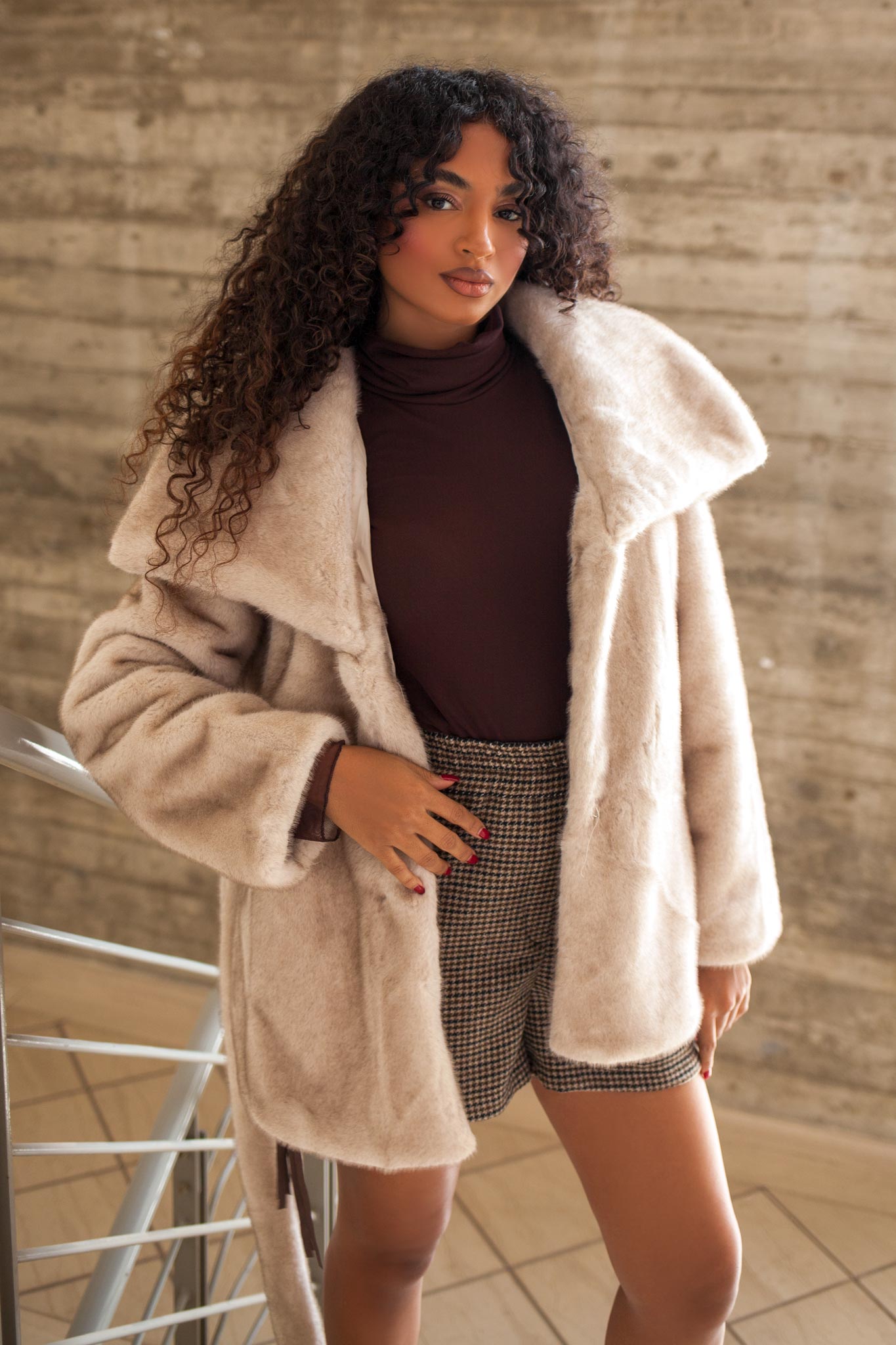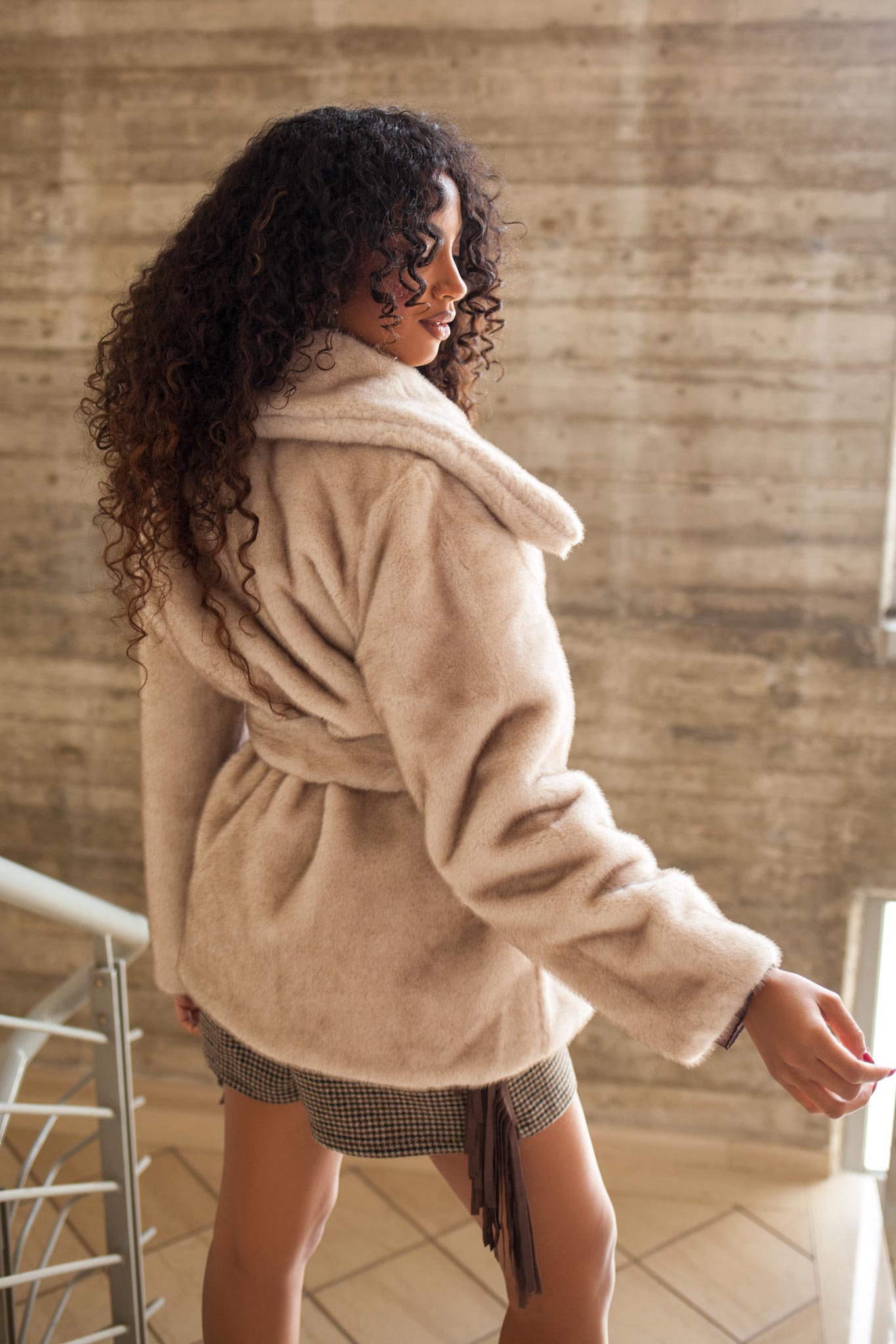 Οικολογική γούνα με δέσιμο στην μέση , κολακεύει το σώμα και προστατεύει από το κρύο. Μήκος 72cm,στήθος 100cm,μανίκι 60cm.