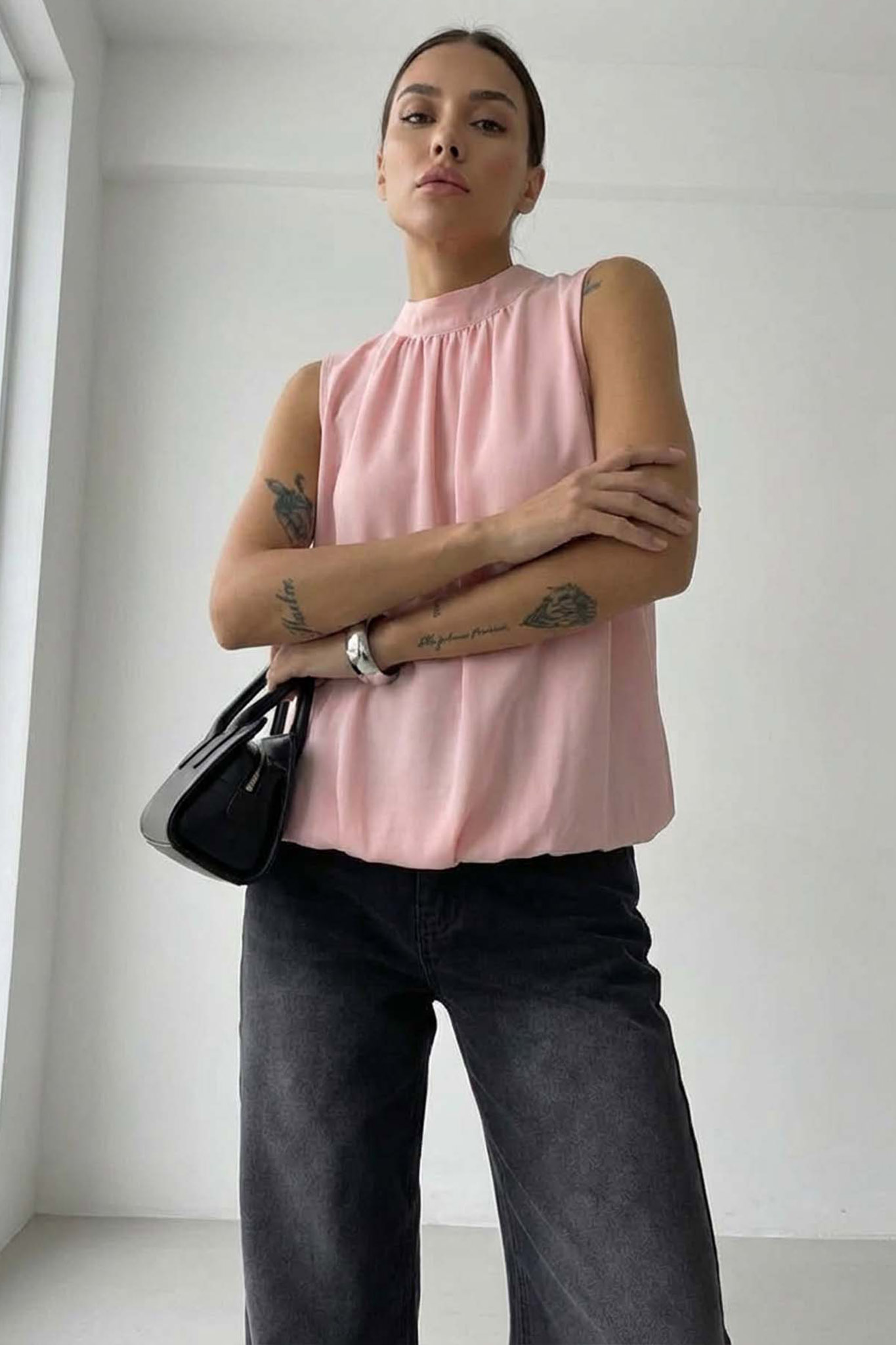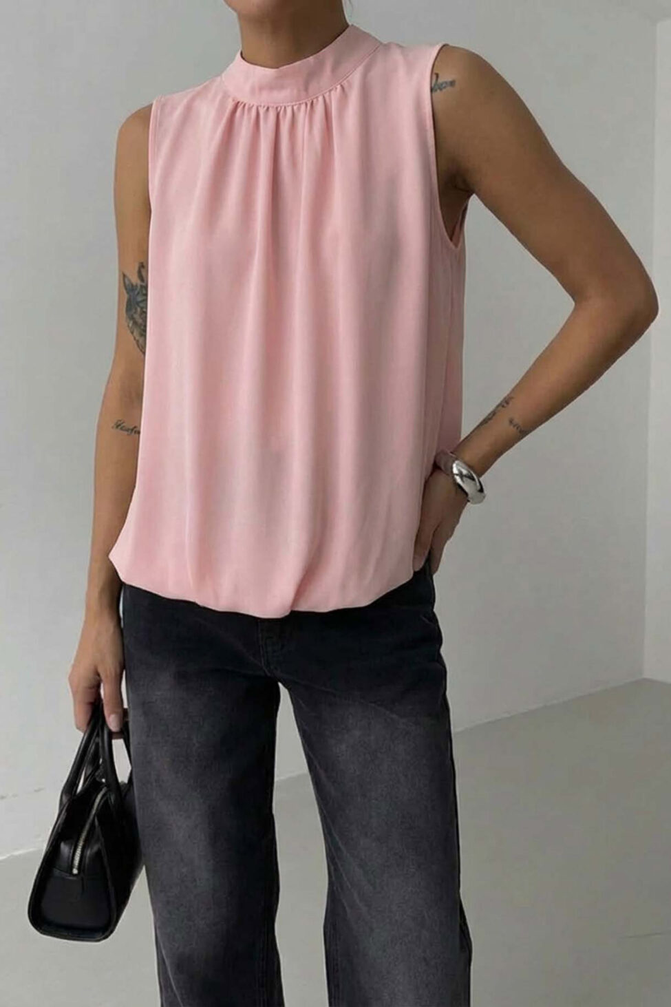 Αναδείξτε τη θηλυκότητά σας με αυτή την αέρινη αμάνικη μπλούζα. Σχεδιασμένη με κομψό όρθιο γιακά και διακριτικές σούρες στο ντεκολτέ που χαρίζουν πλούσιο όγκο και κίνηση, αποτελεί το ιδανικό κομμάτι για layering κάτω από σακάκια ή για μια chic καλοκαιρινή εμφάνιση. Η άνετη γραμμή της και το ελαφρύ ύφασμα εξασφαλίζουν στυλ και δροσιά καθ’ όλη τη διάρκεια της ημέρας.