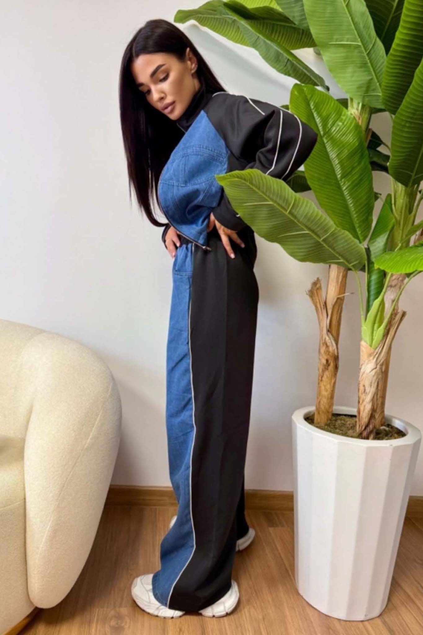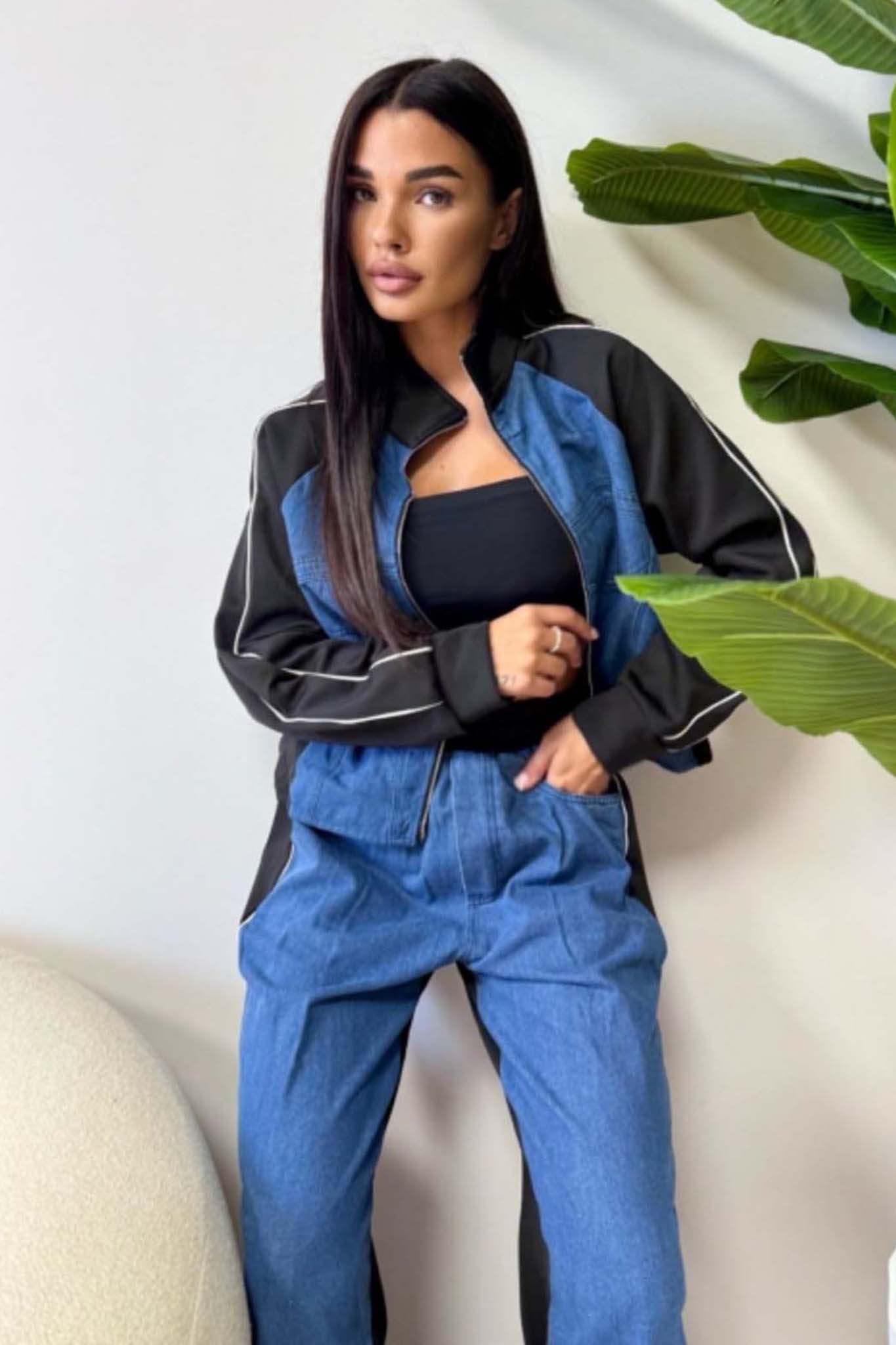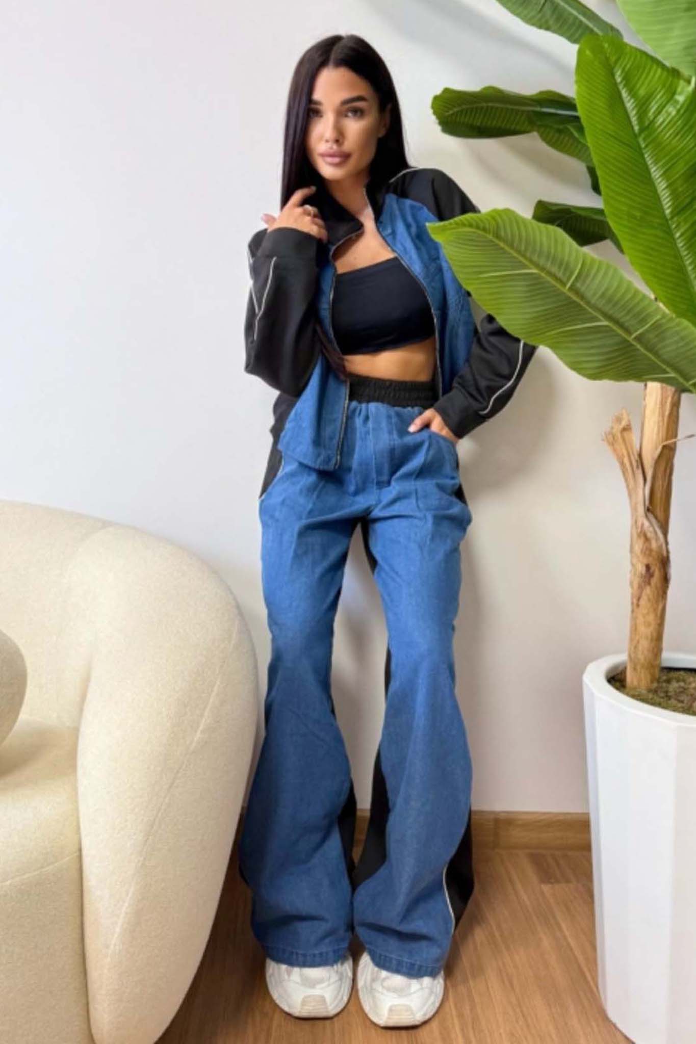 Ανανεώστε το casual στυλ σας με αυτό το μοντέρνο σετ που συνδυάζει άνεση και στυλ. Το σετ περιλαμβάνει μαύρο crop top, ζακέτα με φερμουάρ σε μαύρο και μπλε χρώμα με αθλητικές λεπτομέρειες, και τζιν παντελόνι σε φαρδιά γραμμή με μαύρες πλαϊνές ρίγες. Ιδανικό για καθημερινές εμφανίσεις με urban διάθεση, συνδυάζεται τέλεια με sneakers για ένα ολοκληρωμένο streetwear look.