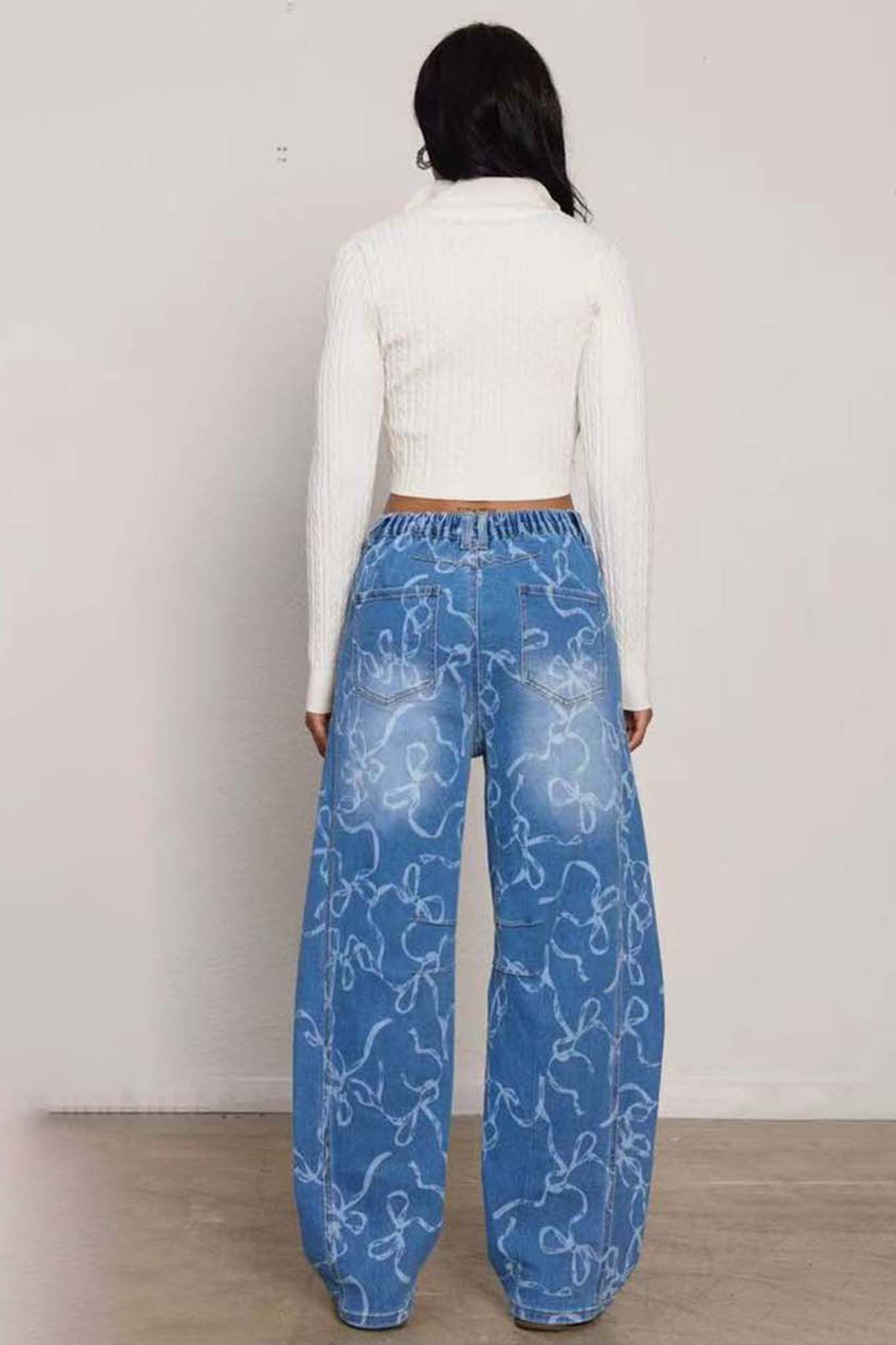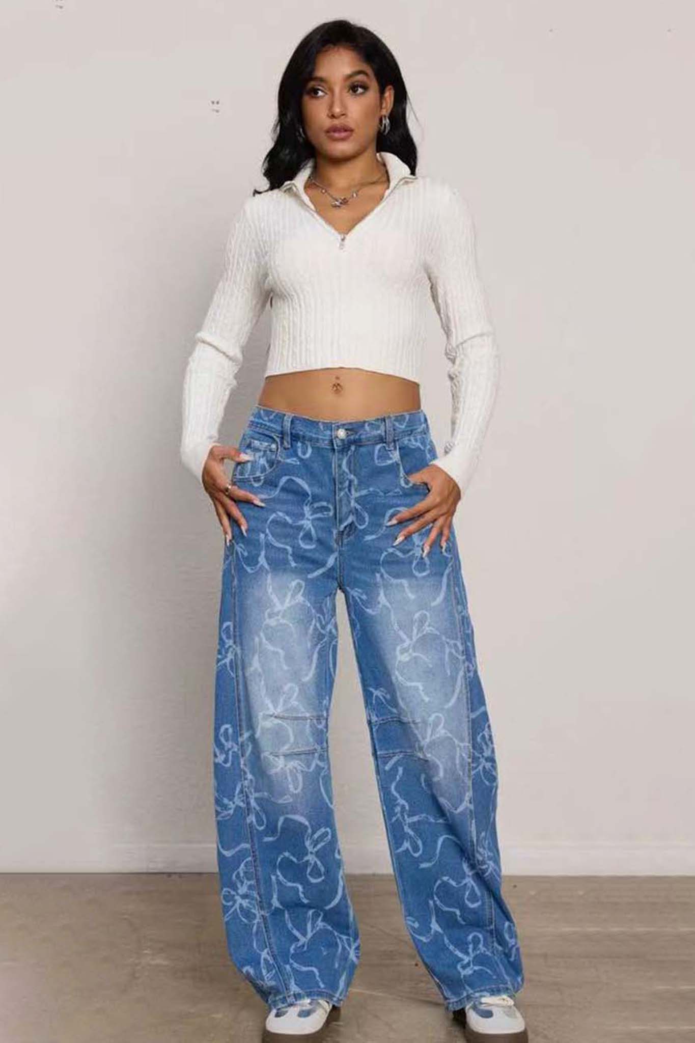 Αυτό το μοντέρνο τζιν σε φαρδιά γραμμή συνδυάζει άνεση και στυλ, ιδανικό για καθημερινές εμφανίσεις. Διαθέτει εντυπωσιακό λευκό αφηρημένο σχέδιο που του δίνει ξεχωριστό χαρακτήρα. Με κλασικό κούμπωμα με κουμπί και φερμουάρ, πέντε τσέπες και χαλαρή εφαρμογή, προσφέρει ευκολία στην κίνηση και μοντέρνα αισθητική. Συνδυάζεται εύκολα με crop tops, πουκάμισα ή φούτερ για ένα ολοκληρωμένο casual look.