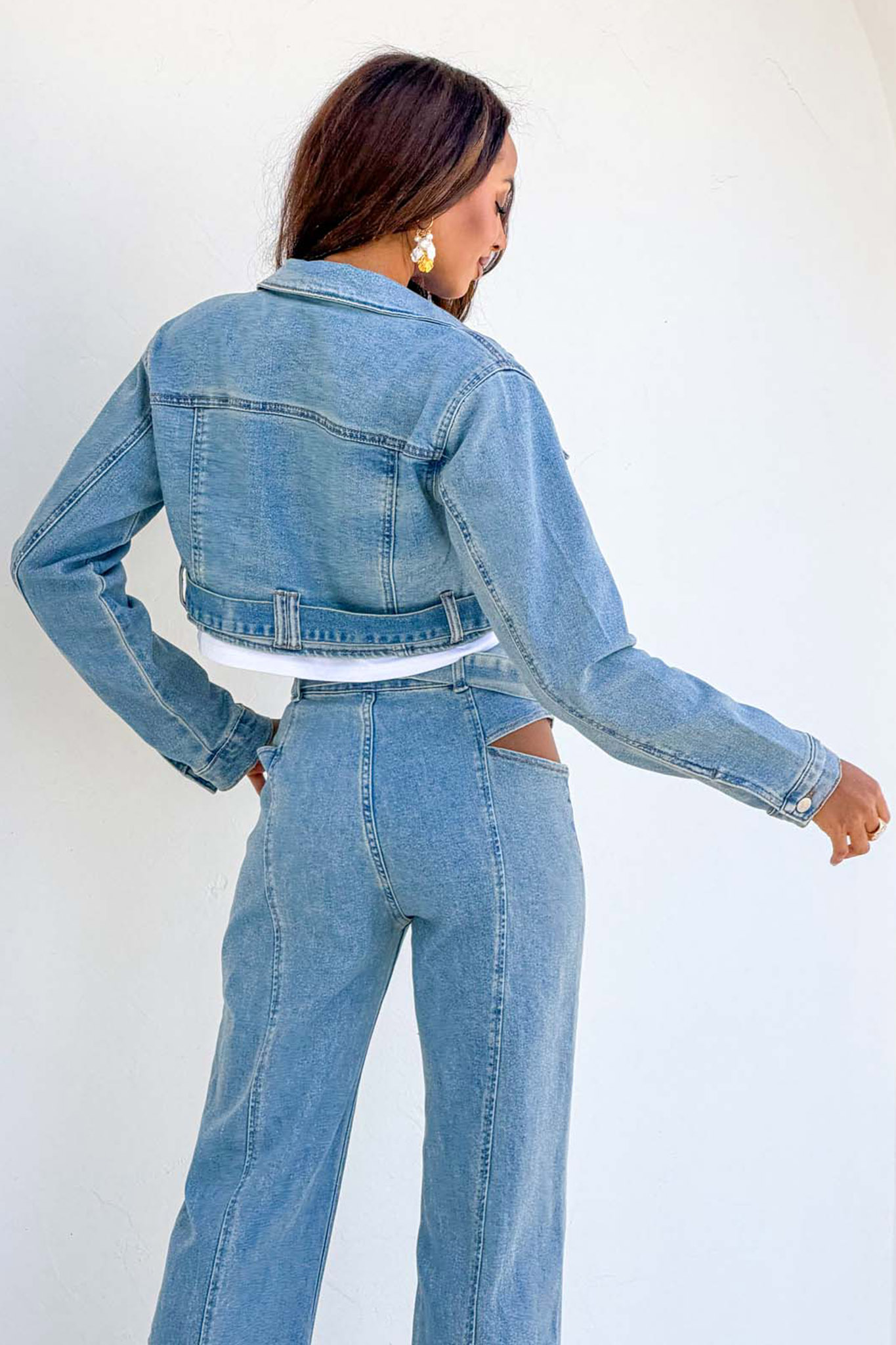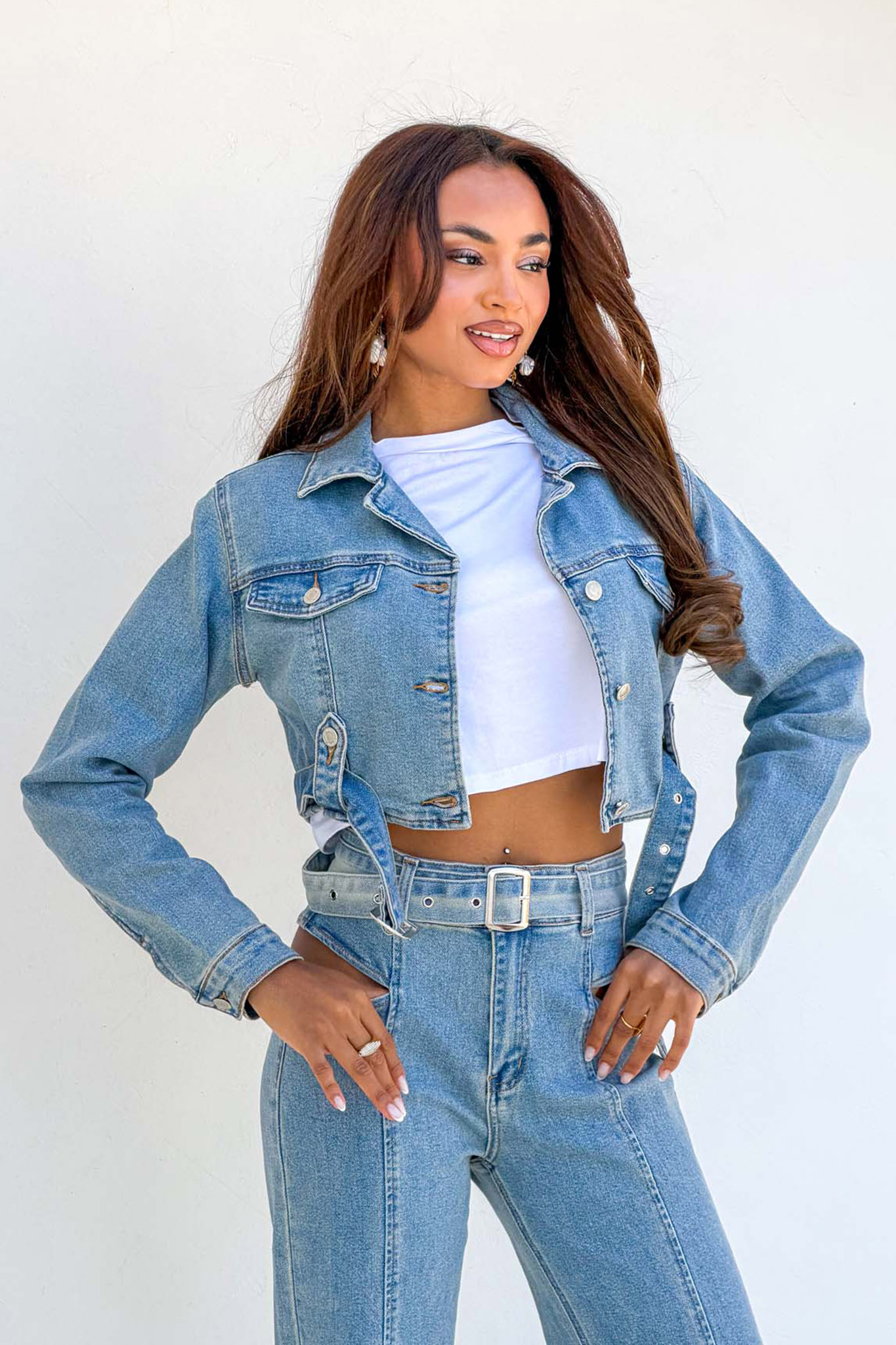 Τζιν μπουφάν σε γραμμή cropped, το οποίο διαθέτει κλασικό γιακά, τσέπες με καπάκια στο στήθος με μεταλλικά κουμπιά, ενώ ξεχωρίζει για την ενσωματωμένη ζώνη με αγκράφα.
