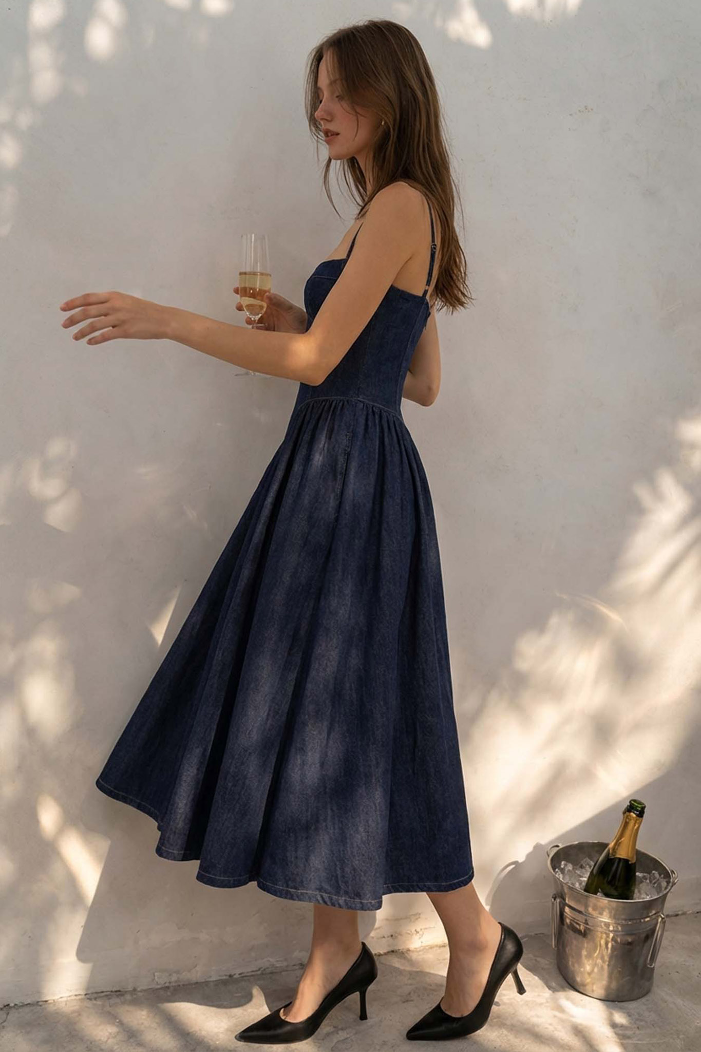 Mίντι φόρεμα το οποίο διακρίνεται για τη θηλυκή και διαχρονική του γραμμή. Διαθέτει τυπου κορσέ με εμφανείς ραφές που σμιλεύουν τη σιλουέτα, λεπτές, ρυθμιζόμενες τιράντες και τετράγωνη λαιμόκοψη. Η μέση είναι στενή και τονισμένη, ενώ από εκεί και κάτω το ύφασμα ανοίγει σε μια πλούσια φούστα σε γραμμή άλφα με απαλές πιέτες που χαρίζουν όγκο και κίνηση.