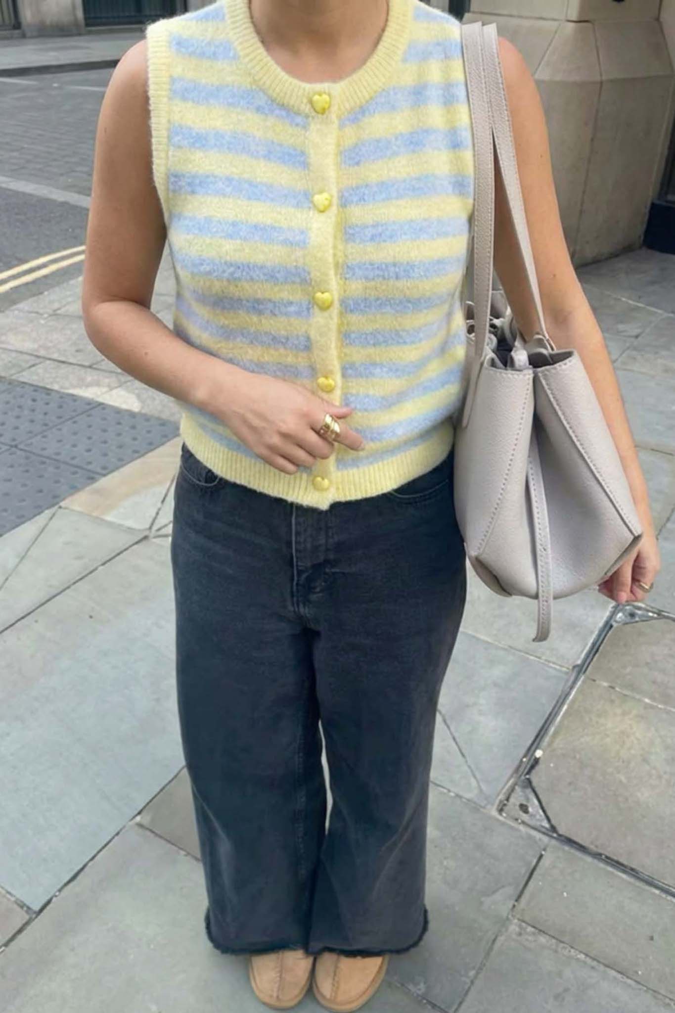 Αμάνικο πλεκτό τοπ με οριζόντιες ρίγες. Διαθέτει στρογγυλή λαιμόκοψη και κλείσιμο με κουμπιά σε σχήμα καρδίας στο μπροστινό μέρος. Η εφαρμογή του είναι άνετη και ελαφρώς κοντή, ιδανική για ανοιξιάτικες και καλοκαιρινές εμφανίσεις. Το μαλακό πλεκτό ύφασμα προσφέρει άνεση και στυλ, ενώ οι απαλοί χρωματικοί τόνοι χαρίζουν φρεσκάδα στο ντύσιμο.
