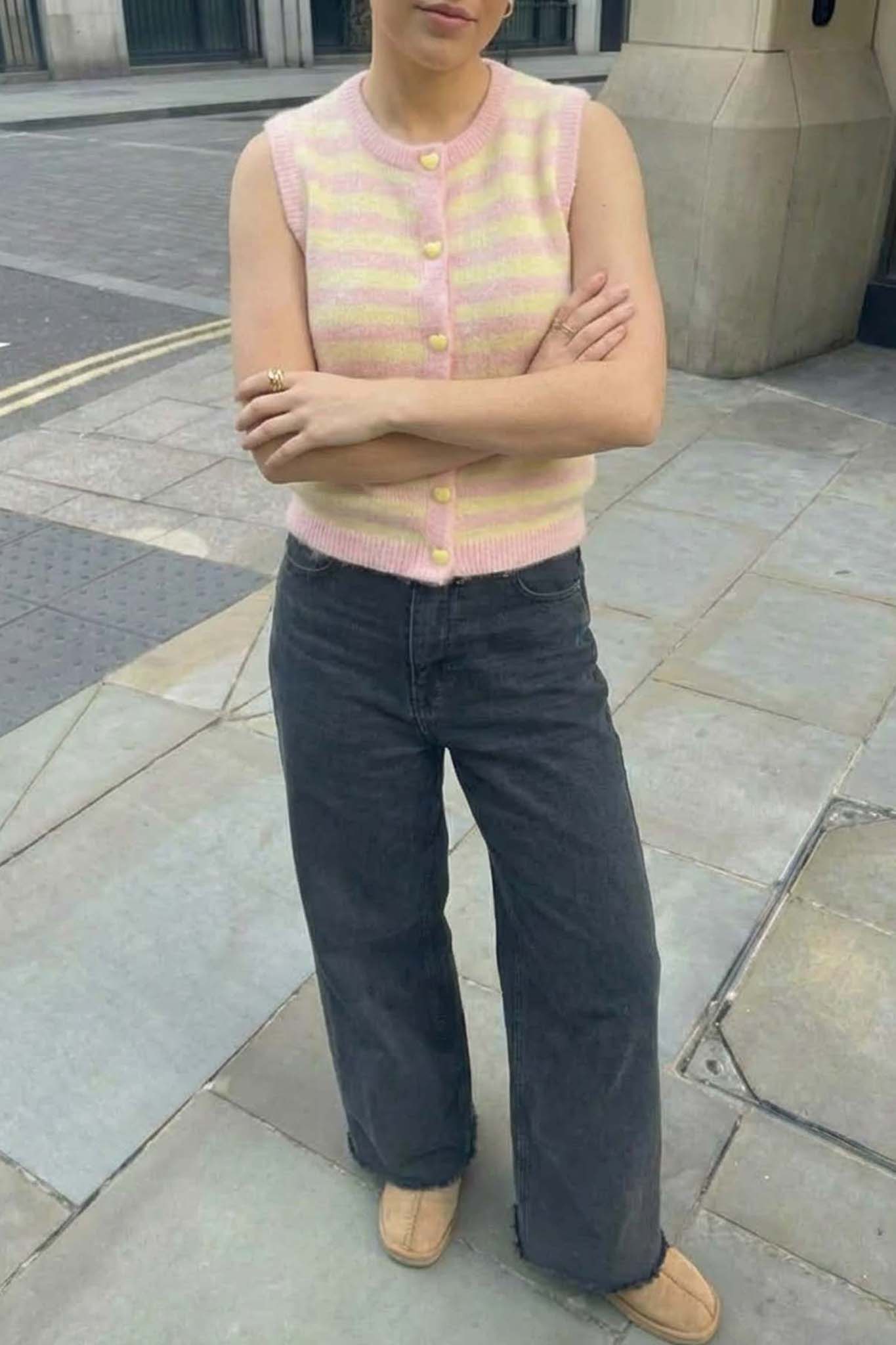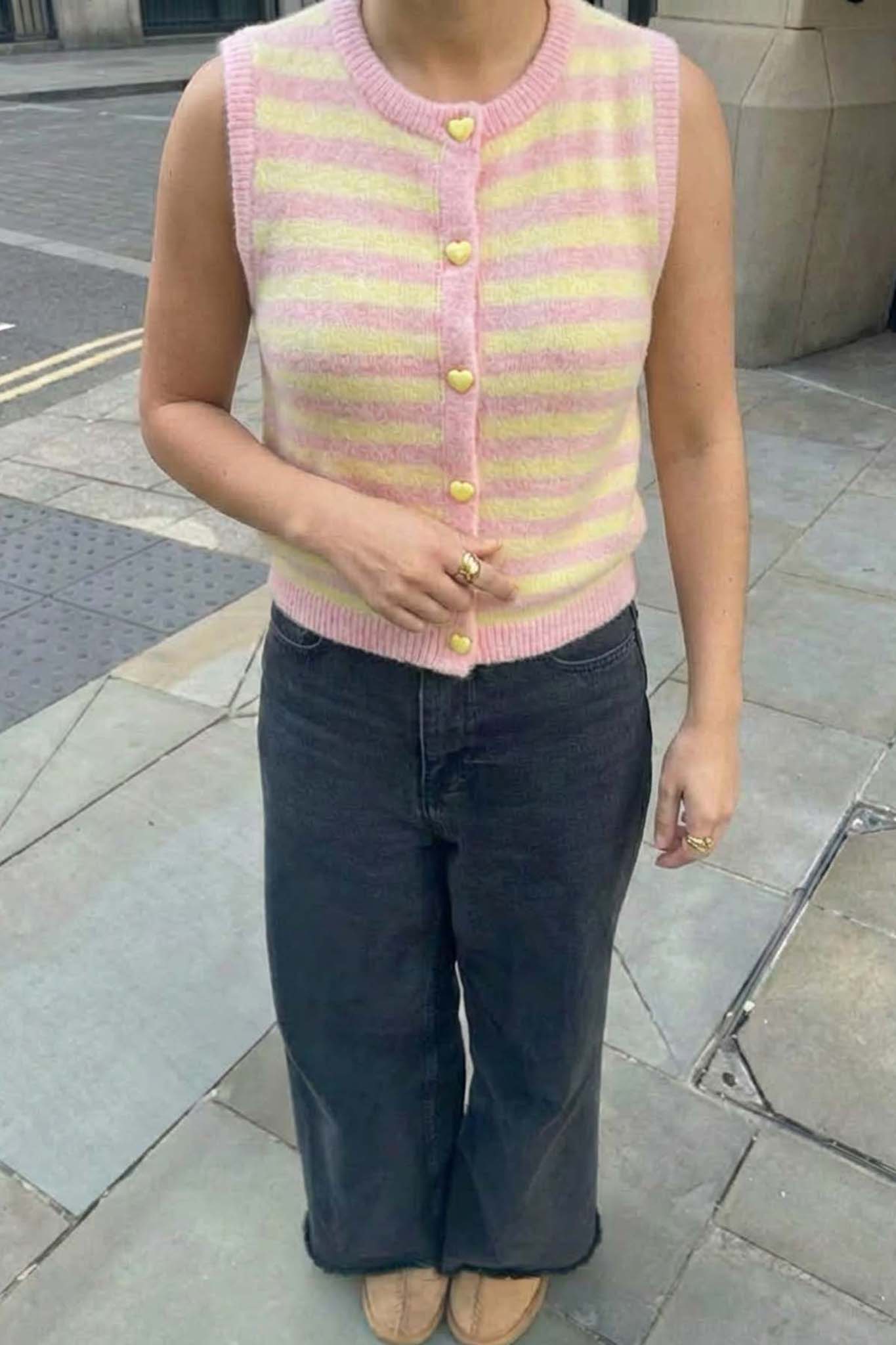 Αμάνικο πλεκτό τοπ με οριζόντιες ρίγες. Διαθέτει στρογγυλή λαιμόκοψη και κλείσιμο με κουμπιά σε σχήμα καρδίας στο μπροστινό μέρος. Η εφαρμογή του είναι άνετη και ελαφρώς κοντή, ιδανική για ανοιξιάτικες και καλοκαιρινές εμφανίσεις. Το μαλακό πλεκτό ύφασμα προσφέρει άνεση και στυλ, ενώ οι απαλοί χρωματικοί τόνοι χαρίζουν φρεσκάδα στο ντύσιμο.