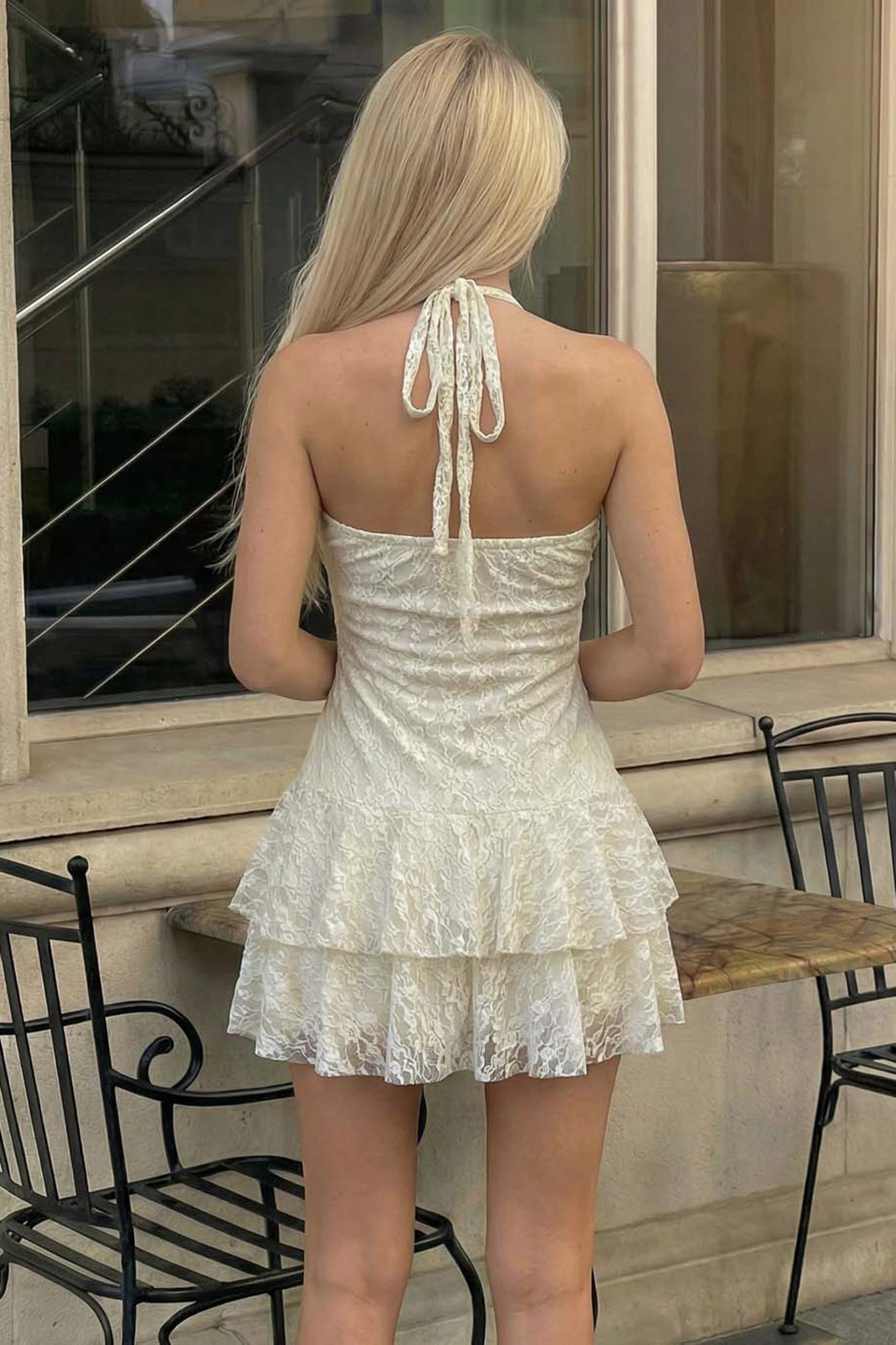 Φόρεμα μίνι κατασκευασμένο από πολυτελή δαντέλα με ανάγλυφη υφή, διαθέτει κομψή halter λαιμόκοψη που δένει στον αυχένα και ντεκολτέ με άνοιγμα και διακοσμητικό κρίκο που τραβάει τα βλέμματα. Η φούστα με τα πολυεπίπεδα βολάν (tiered ruffles) και το διακριτικό βολάν που διατρέχει το μπροστινό μέρος χαρίζει κίνηση και μια παιχνιδιάρικη διάθεση σε κάθε σας βήμα.