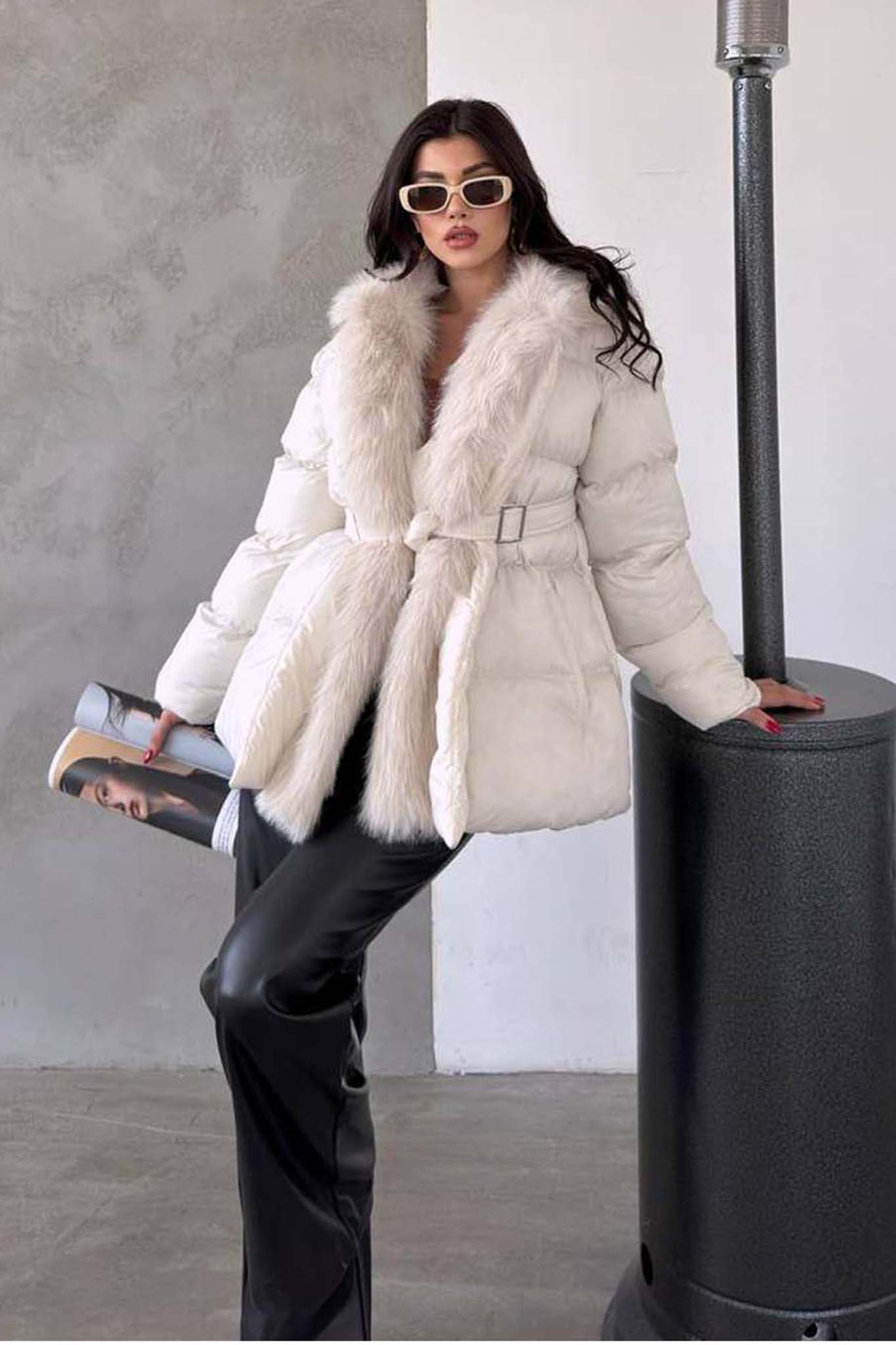 Καπιτονέ μπουφάν με οικολογική γούνα. Με τσέπες και ζωνάκι.