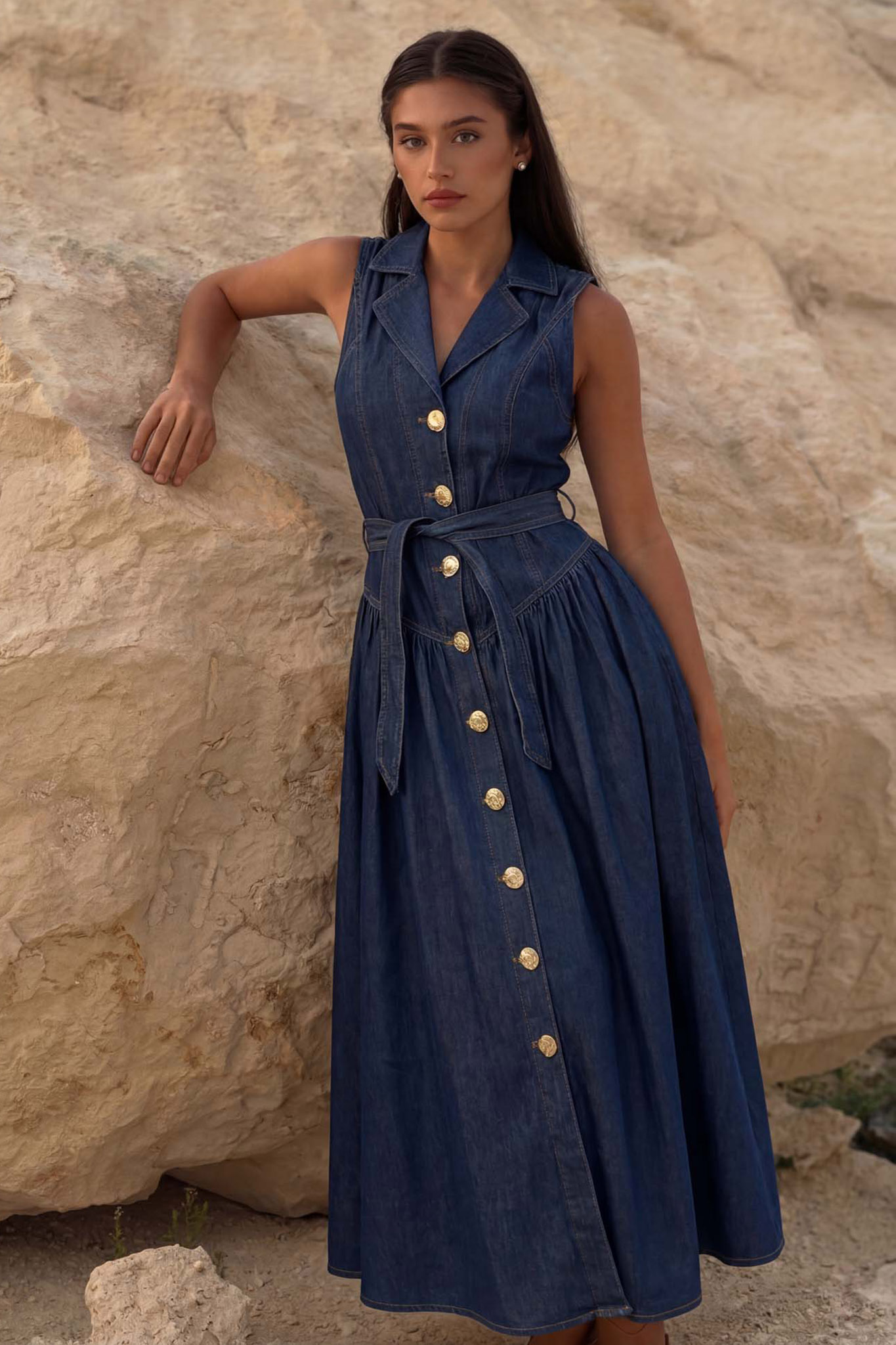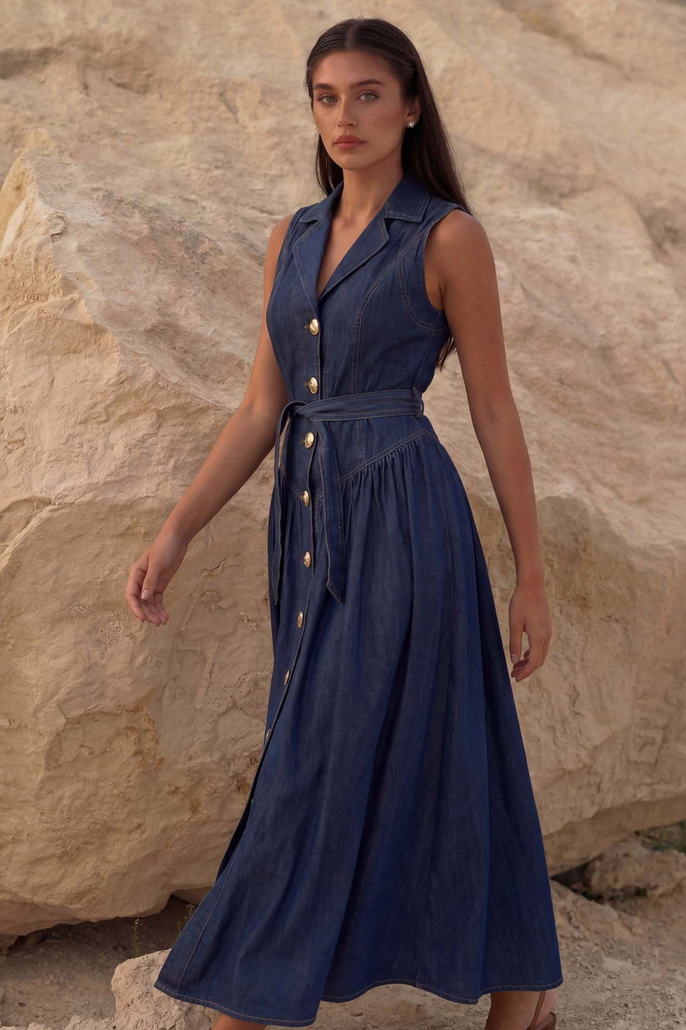 Αμάνικο μάξι τζιν φόρεμα με γιακά και κουμπιά. Διαθέτει ζωνάκι για να αναδεικνύει τη σιλουέτα. Ιδανικό για να φορεθεί από το πρωί έως το βράδυ.