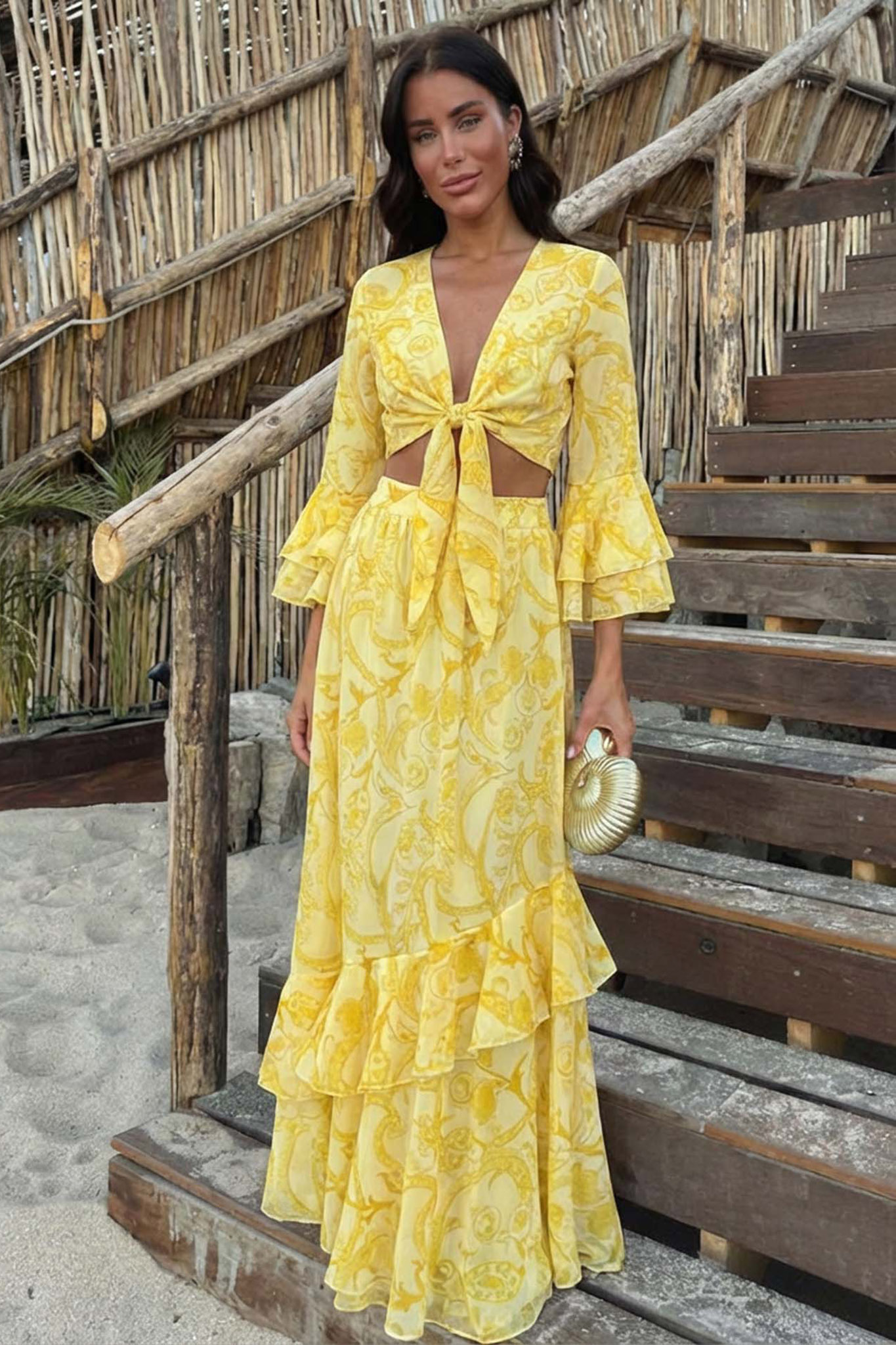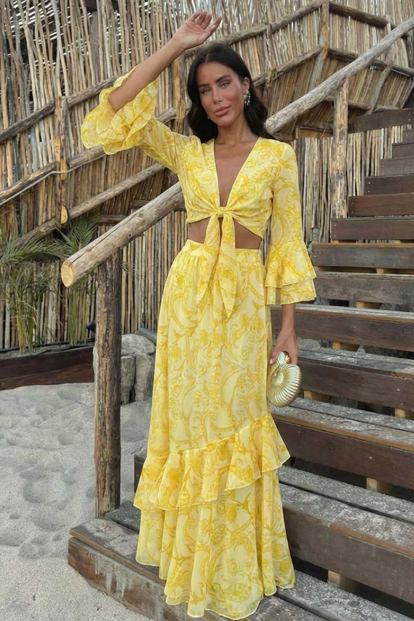 Boho σετ τοπ-φούστα με λαχούρια το οποίο αποτελείται από ένα κρουαζέ crop top που δένει μπροστά, αναδεικνύοντας τη μέση, και διαθέτει εντυπωσιακά μανίκια με βολάν για μια δόση ρομαντισμού. Η ασορτί maxi φούστα ακολουθεί την ίδια κίνηση με βολάν στο τελείωμα.