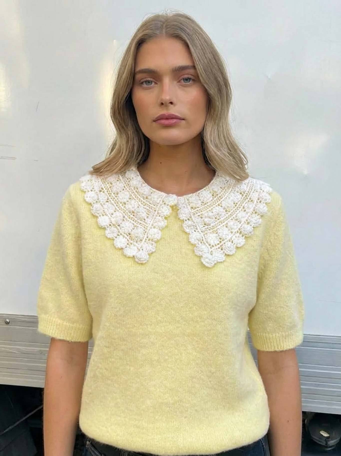 Κομψό πλεκτό τοπ, με κοντά μανίκια και άνετη εφαρμογή. Διαθέτει εντυπωσιακό, φαρδύ γιακά από λευκή δαντέλα με περίτεχνο σχέδιο και στρογγυλεμένες άκρες, που προσθέτει ρομαντική και vintage αισθητική. Ιδανικό για ανοιξιάτικες και καλοκαιρινές εμφανίσεις, συνδυάζεται εύκολα με τζιν ή φούστα για ένα θηλυκό και κομψό look.